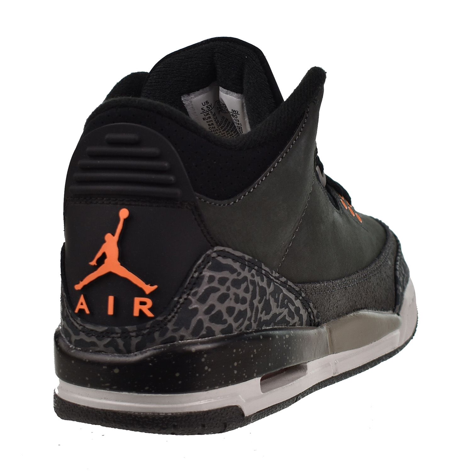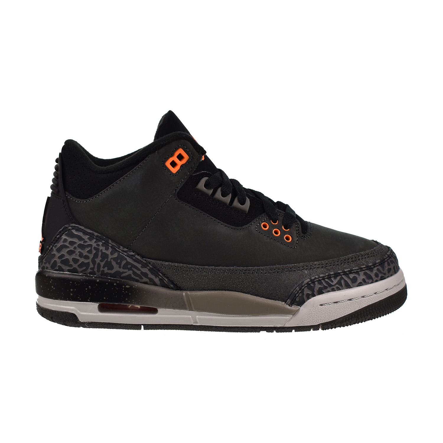 A decade after its initial release, the Jordan 3 Retro Fear Pack (2023) (GS) makes a comeback, this time tailored for grade school kids. A decade after its initial release, the design of the Fear Pack Jordan 3 Retro (2023) (GS) effortlessly merges tonal elephant print overlays with dark gray nubuck. The collar and tongue are adorned with black suede, highlighted by a Total Orange embroidered Jumpman logo Noteworthy Total Orange eyelets seamlessly merge with a Jumpman icon positioned on the back heel. Crafted for optimal comfort and longevity, the shoe incorporates an Air-sole unit tinged with orange and a polyurethane midsole that seamlessly blends three colors, presenting a fusion of performance and style.