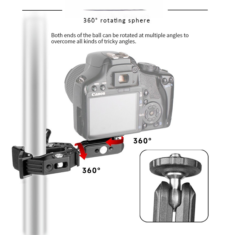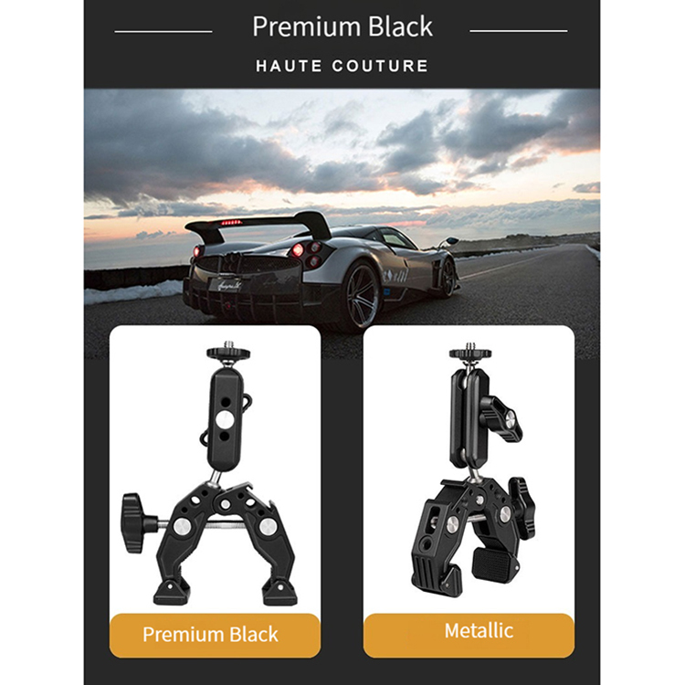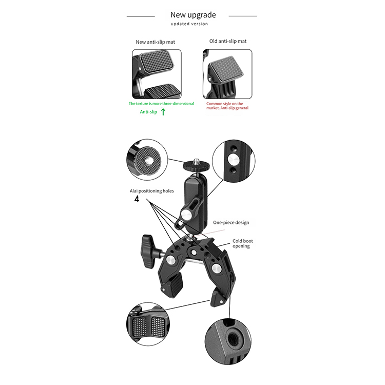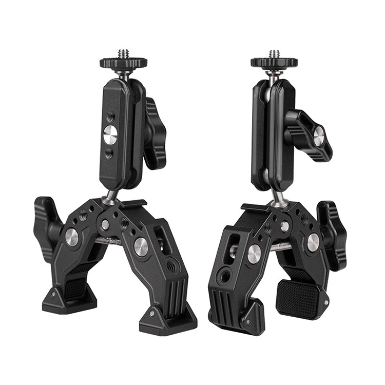 Dual clamp design with multiple connections such as 1/4 screw, 1/4 screw holes, alai locating holes, etc.
