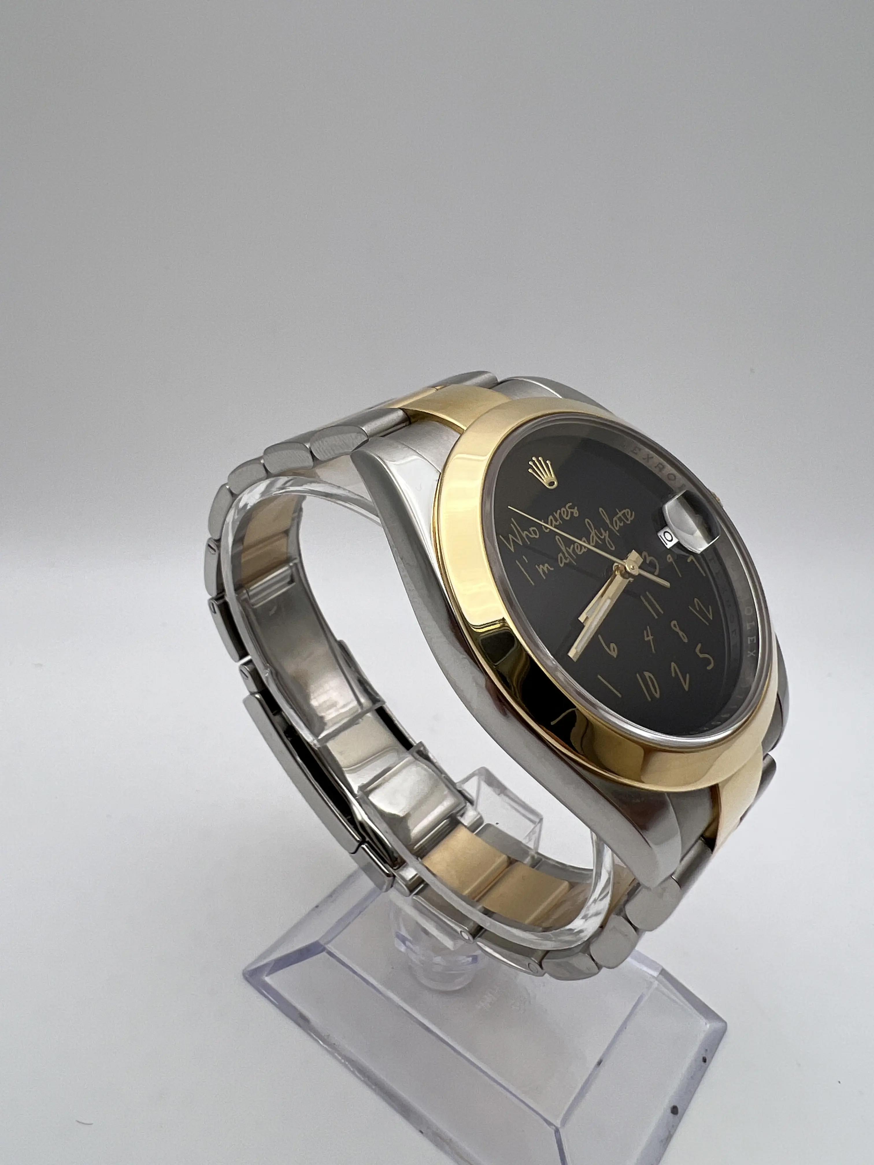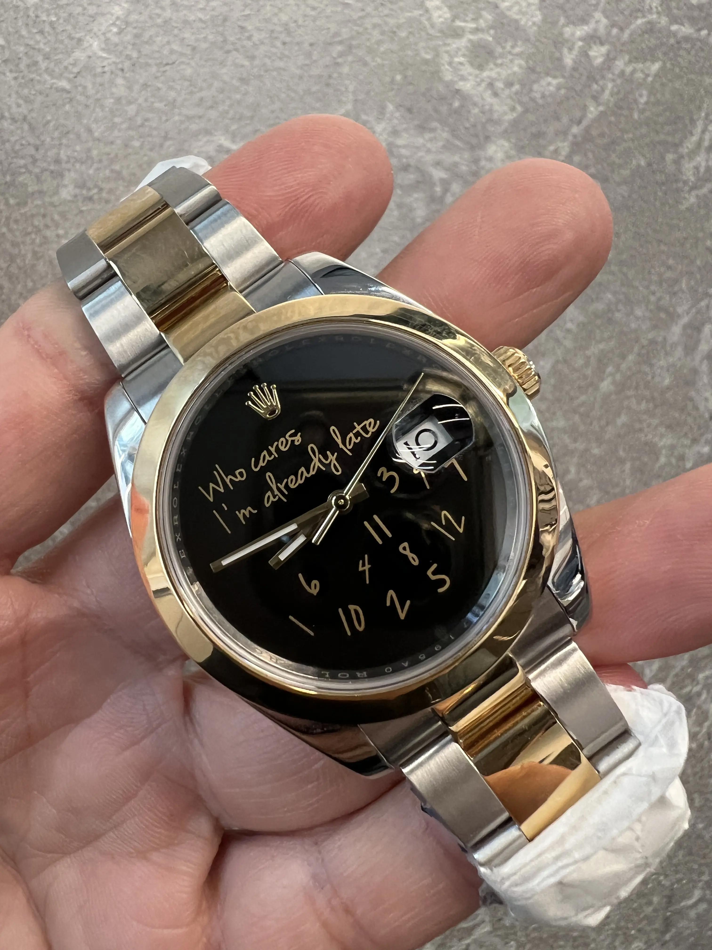 The Rolex Datejust 41, reference 126303, features a custom "Who Cares I'm Already Late" black dial, adding a playful twist to the classic design. This watch comes with a 41mm stainless steel and 18K yellow gold case, along with a smooth yellow gold bezel. Powered by the automatic calibre 3235 movement, it ensures precise and reliable timekeeping. The watch is completed with a stainless steel and 18K yellow gold Oyster bracelet, combining luxury with durability. Included is a leatherette travel pouch for secure shipping and transport. 1 year seller warranty and certificate of appraisal included. Message or call to inquire.