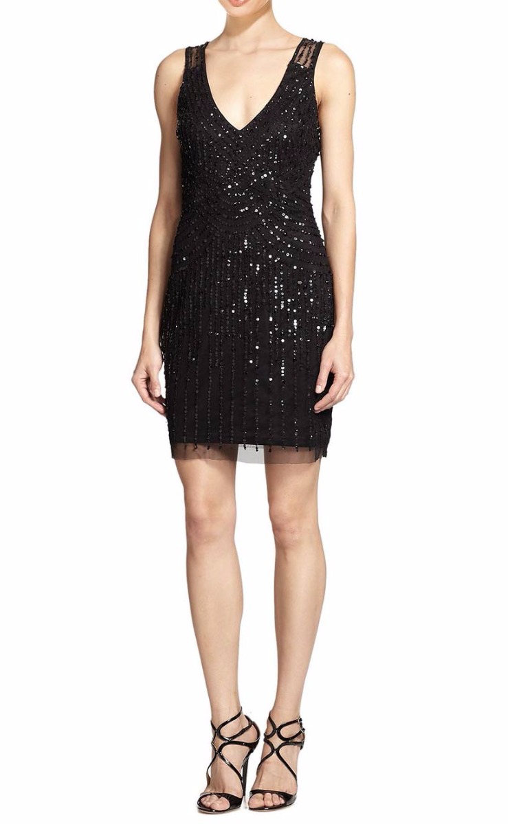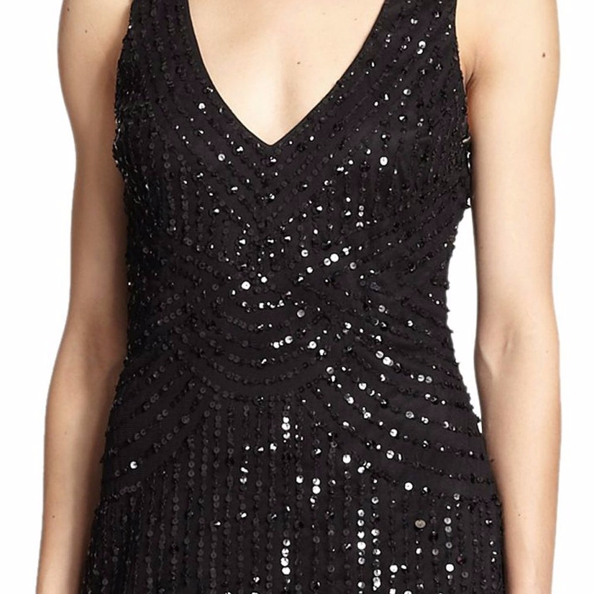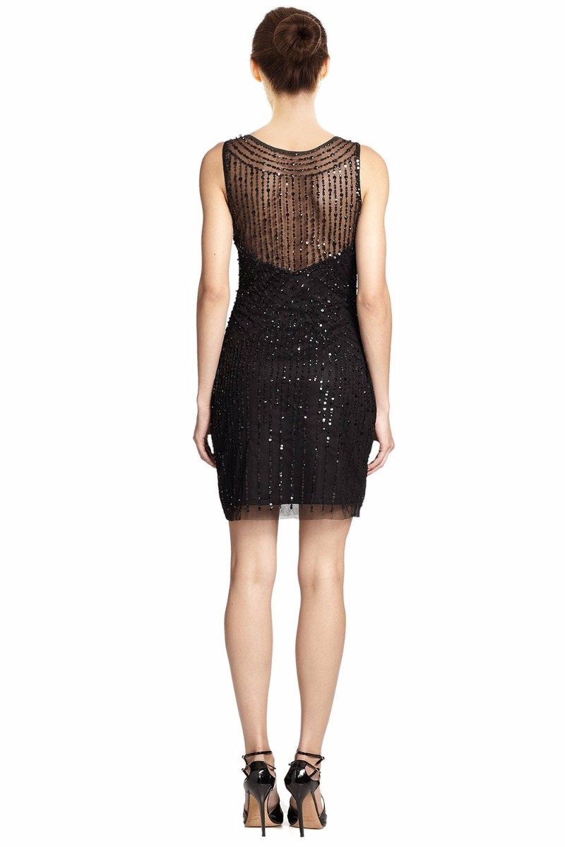 Sparkle at your next event with this cocktail dress from Aidan Mattox. This elegant sleeveless mini dress is fully lined in a formfitting, stretch fabric for comfort. It boasts integral padding at the bust for a form-enhancing fit and a plunging V neckline for an ultra feminine finish. Concealed back zip fastening completes this design which features a delicate tulle overlay hand embellished with light-reflecting black sequins and a sheer back