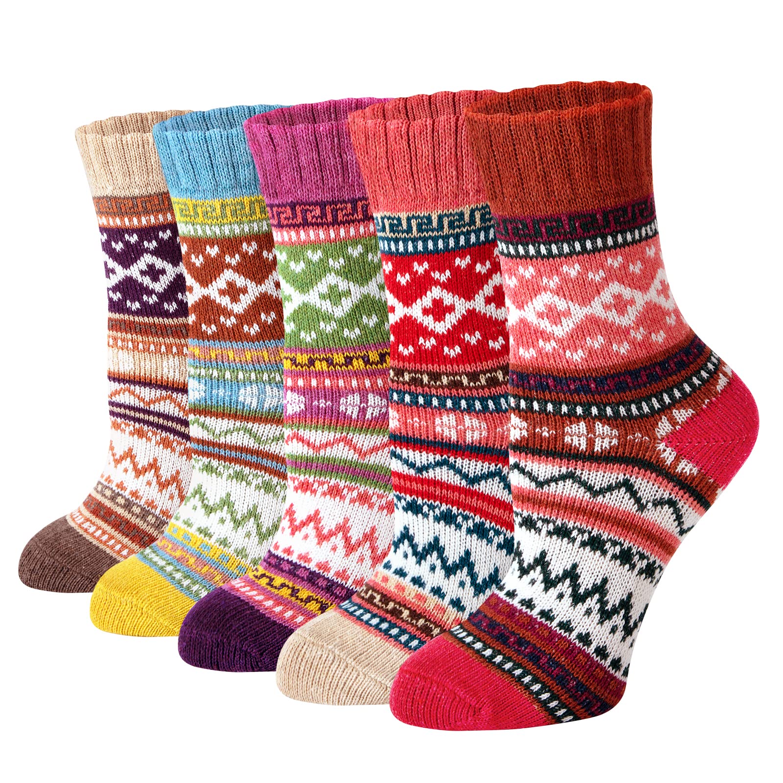 Description 5 Pairs Womens Wool Socks Thick Warm Soft Knit Cozy Crew Winter Socks Christmas Gifts About the Product Fabric: wool, cotton and polyester 5 Pairs: Each pack of our womens socks 5 pairs with a different combination of colors Color: These wool socks feature stylish patterns and vibrant colors that will put a fun finishing touch on your outfits Size: size 23 to 25 cm, is suitable for women US shoe size 5 to 9 Present: Wool socks for women can be used as presents for special festivals; Provide warmth for your lover in cold winter Package : 5 pairs of winter socks Note Please: Machine wash, hand wash Due to differences between monitor displays, actual color may vary slightly from image