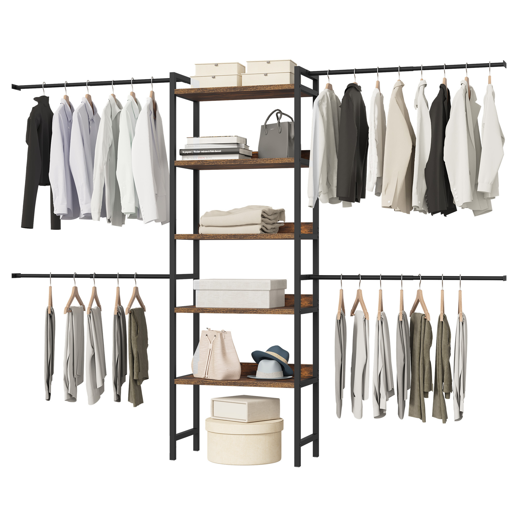Our Clothes Rack Storage Organizer is crafted with heavy-duty black matte tubing, ensuring both elegance and longevity. Perfect for high-traffic areas, it withstands daily use with ease, keeping your wardrobe organized and stylish.