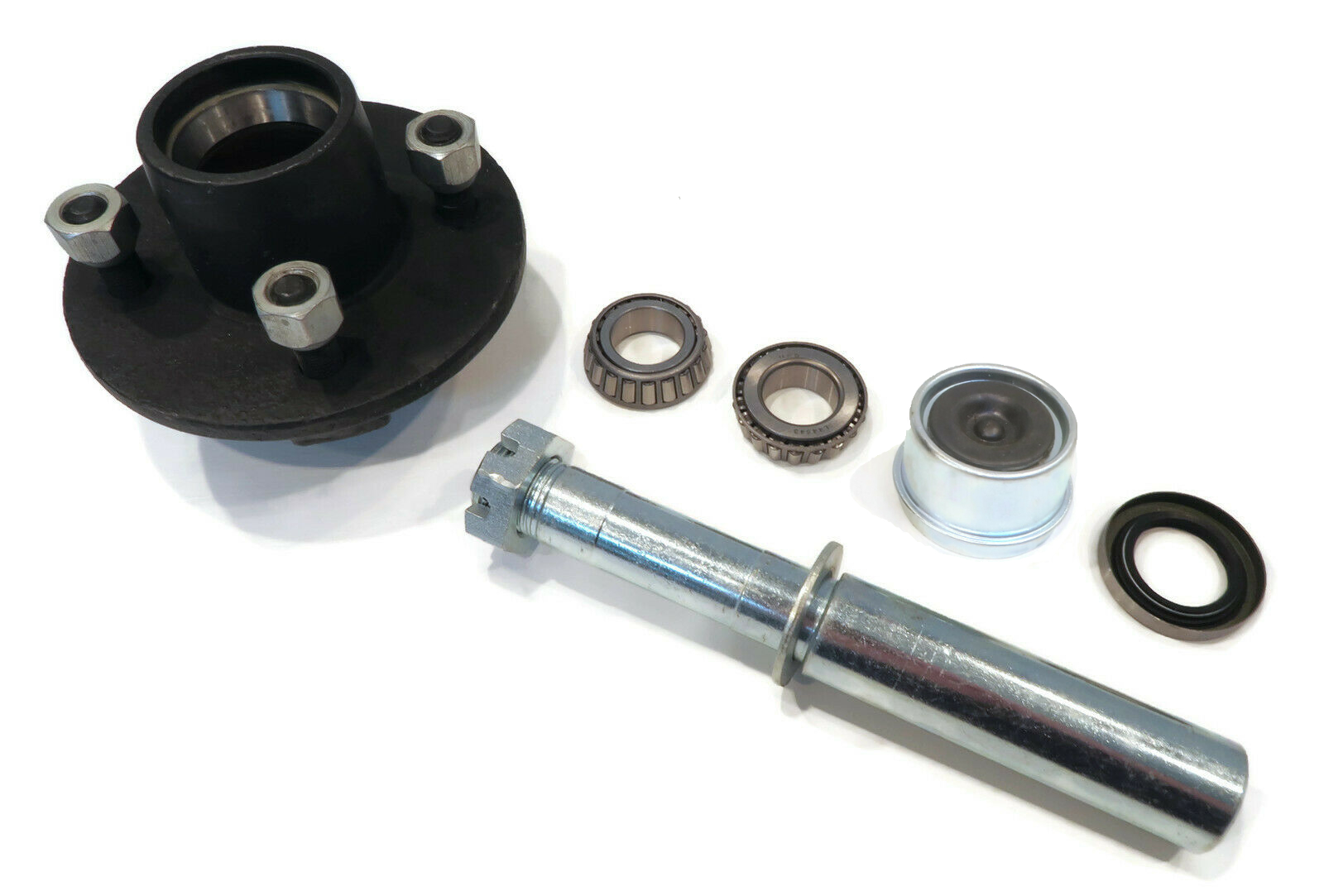 • Includes - (4) Idler Hub with Lug Nuts, (4) 1" BT8 Round Spindle with Castle Nut, Pin & Washer, (4) Inner/Outer Bearings, (4) Double-lip Grease Seal (1 1/4" I.D. / 2" O.D.), (4) 2" Grease/Dust Cap; comes as shown in the first image