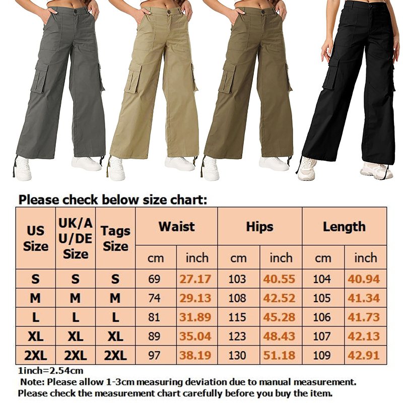 Description: Gender: Women, Woman, Ladies Lady, Female, Girls Style: Women Cargo Pants, Straight Wide Leg Trousers, Long Pant, Loose Casual Trousers, Sports Jogger Pants, Belt Loop Hippie Pant Pattern Type: Solid Color Color: Black, Apricot,ArmyGreen,(Optional) Size: XS-XL (Follow the size chart to select please) Material:Polyester Waist: High Waist Length: Full Length Season: Spring, Summer, Autumn, Fall, Winter Occasions: Casual, Traveling, Vacation, Working, Party, Everyday, Dates, Movies, Daily, School, Holiday, Street, Picnic, Beach,Yoga Package Content: 1 x Women Cargo Pants (Other Accessories are not included) Tips: 1. Please compare the detail sizes with yours before you buy!!! 2. Colors may be slightly different depending on computer and monitor settings. 3. Please allow 1-3cm differs due to manual measurement, thanks. (All measurement in cm and please note 1cm=0.39inch, 1inch=2.54cm)