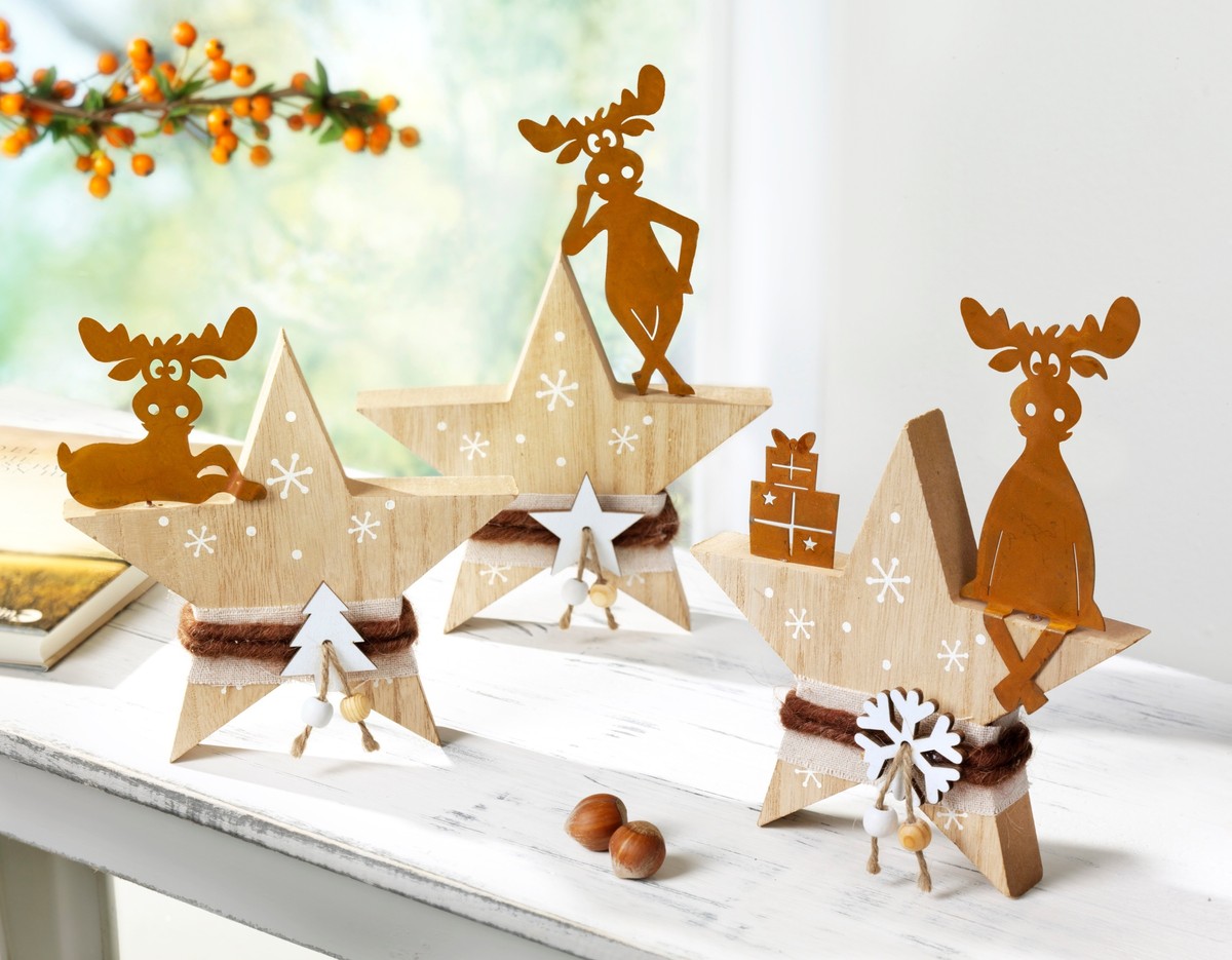 Deko-Sterne mit Rentier 3er-Set | liebevoll verzierte Holzsterne mit Rentier-Silhouette aus Metall | 3 unterschiedliche Designs | bis 20 cm Höhe