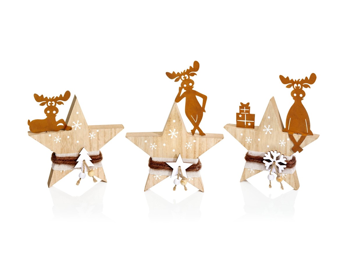 Deko-Sterne mit Rentier: • 3er-Set mit 3 Designs • Sterne aus Holz, beidseitig mit weißem Dekor-Print • je mit origineller Elch-Silhouette aus Metall mit Edelrost-Finish • Bänder-Verzierung mit Holzperlen und weißer Holzdeko: je 1 x Schneeflocke, Stern und Tanne • zum Aufstellen.