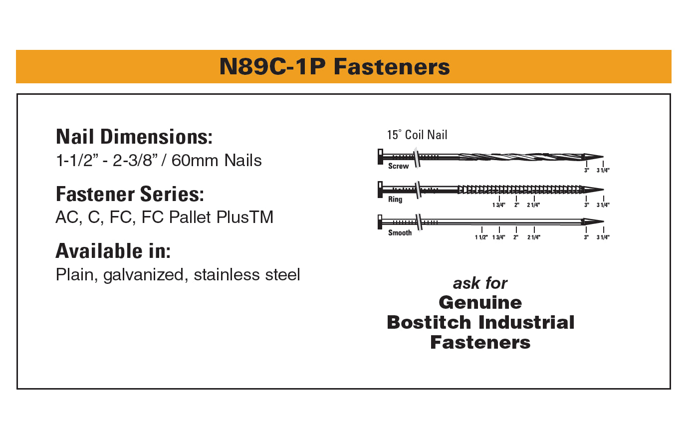 The N89C-1P coil pallet nailer is a medium sized 8.4 lb tool that shoots from a 1 3/4" - 3 1/2" length coil pallet nails. The diamater renages from .099-.131 diameter nails with rubber grip and easy open canister for added comfort.