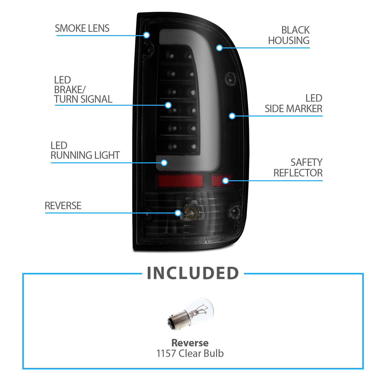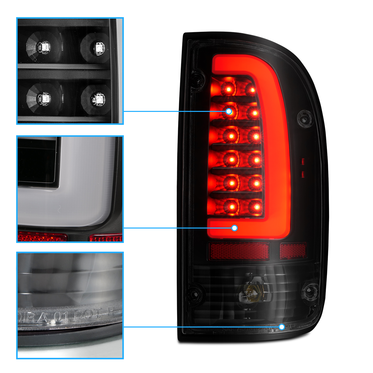 1995-2000 Replacement Smoke Black LED Bar Taillight Set for Toyota Tacoma w/Bulb$126.52NewPerformance/CustomYesLED, Halogen1157 BulbDOT, SAE CompliantRear, Left, RightTaiwanATTENTIONFits:
