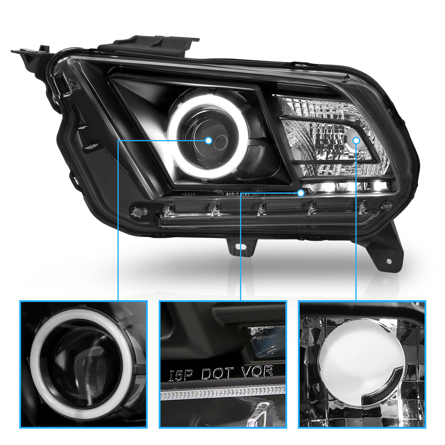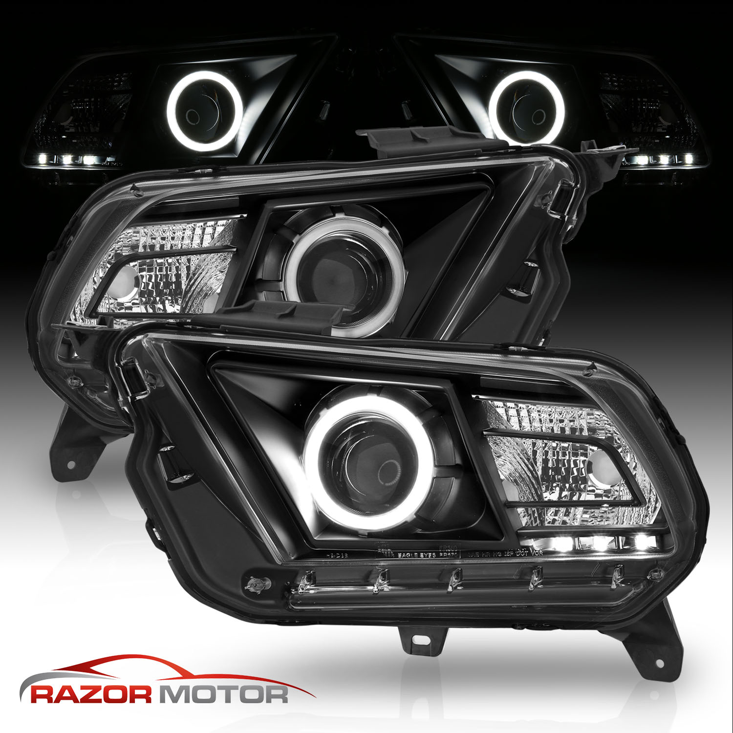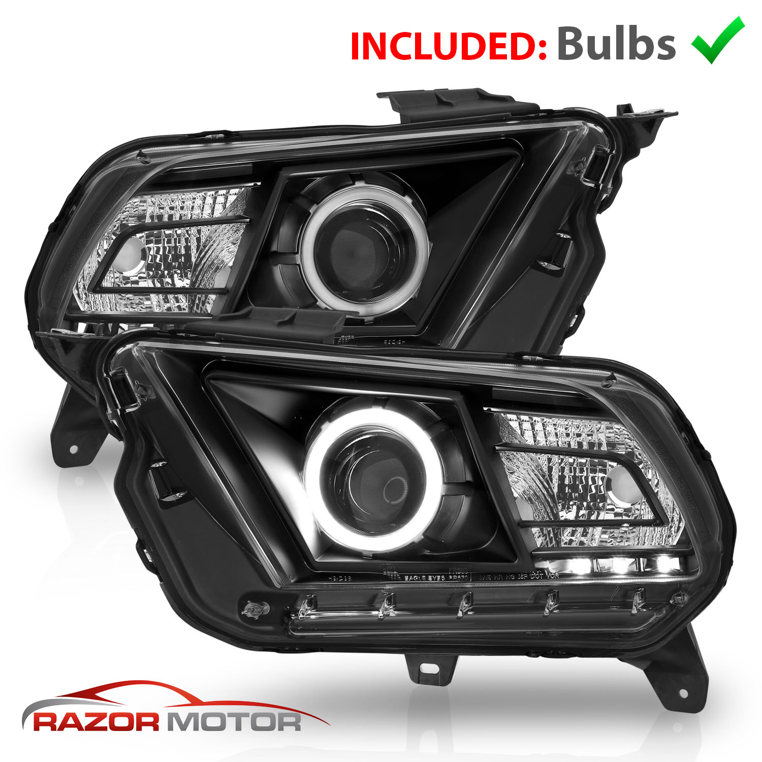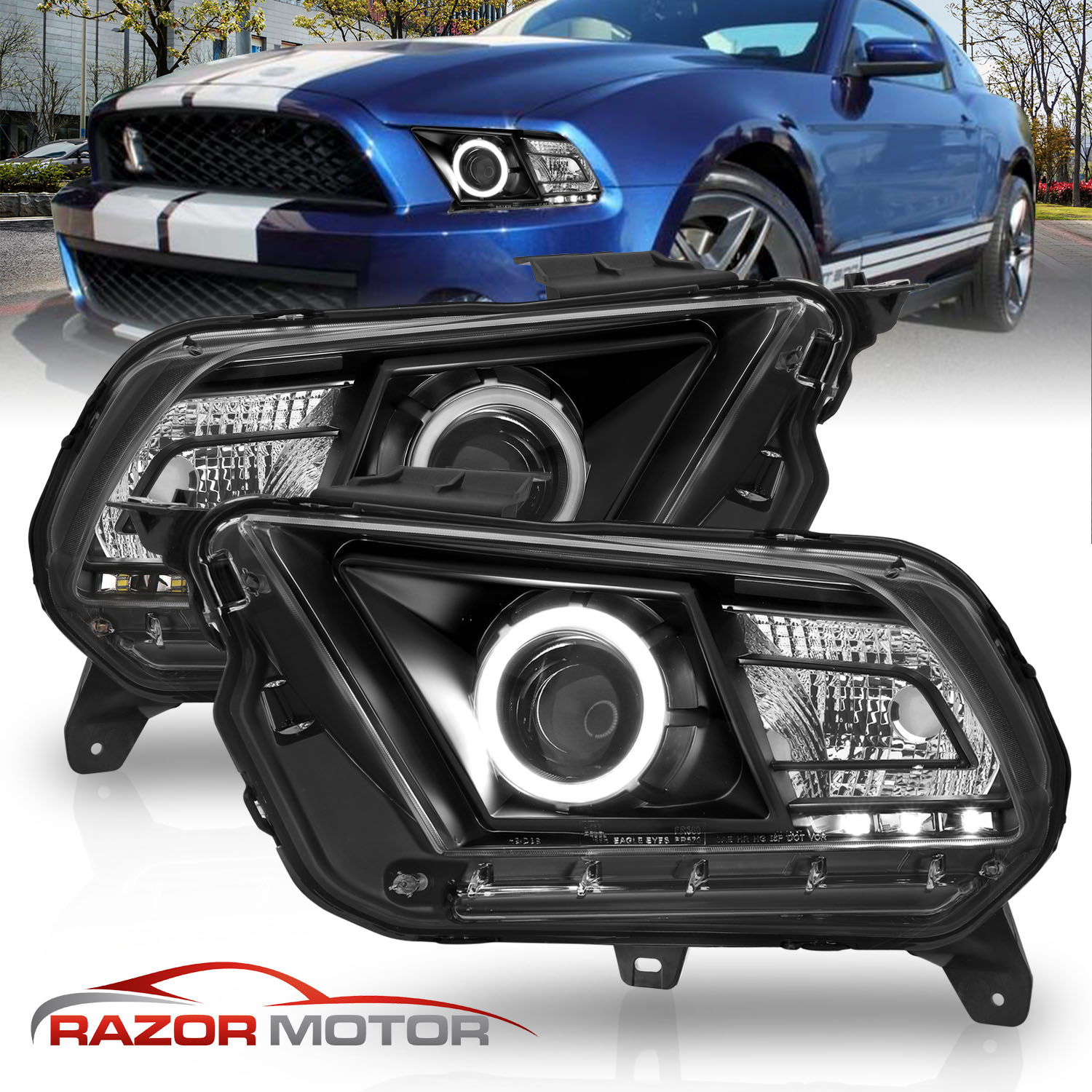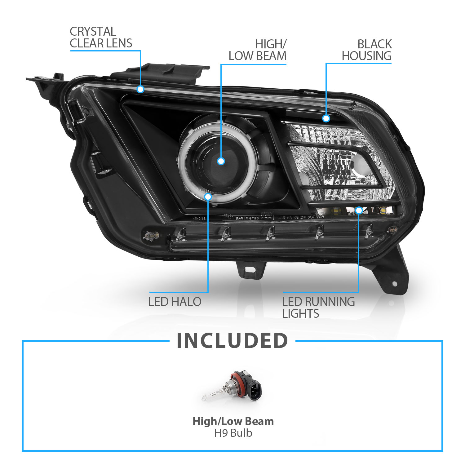 Fit 2010-2014 Ford Mustang Black Housing Halo LED Projector Headlights$242.49NewReplacement/DirectYesHalogenH9 BulbDOT, SAE CompliantFront, Left, RightTaiwanDoes Not Fit Models with Stock Xenon HID ModelsATTENTIONFits: