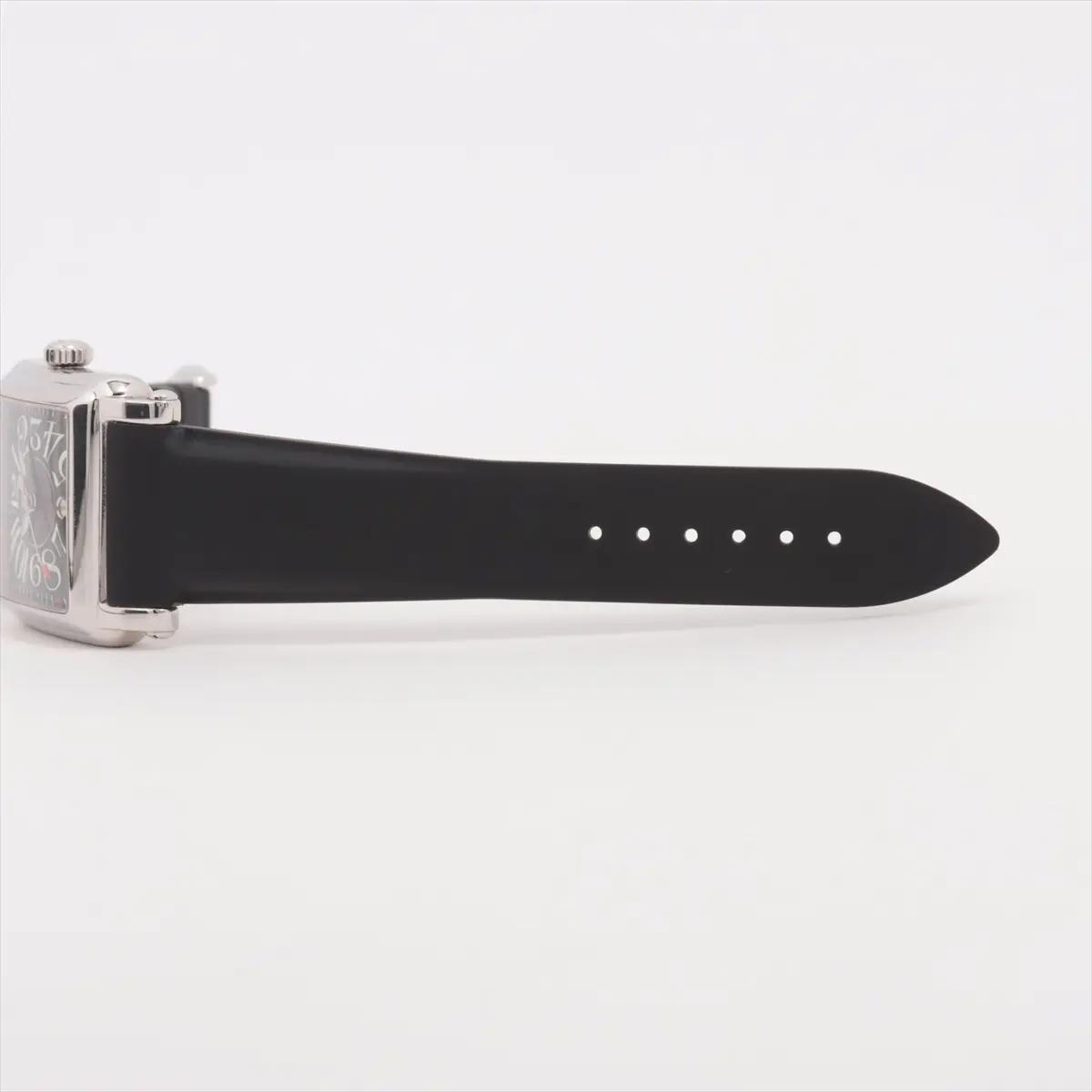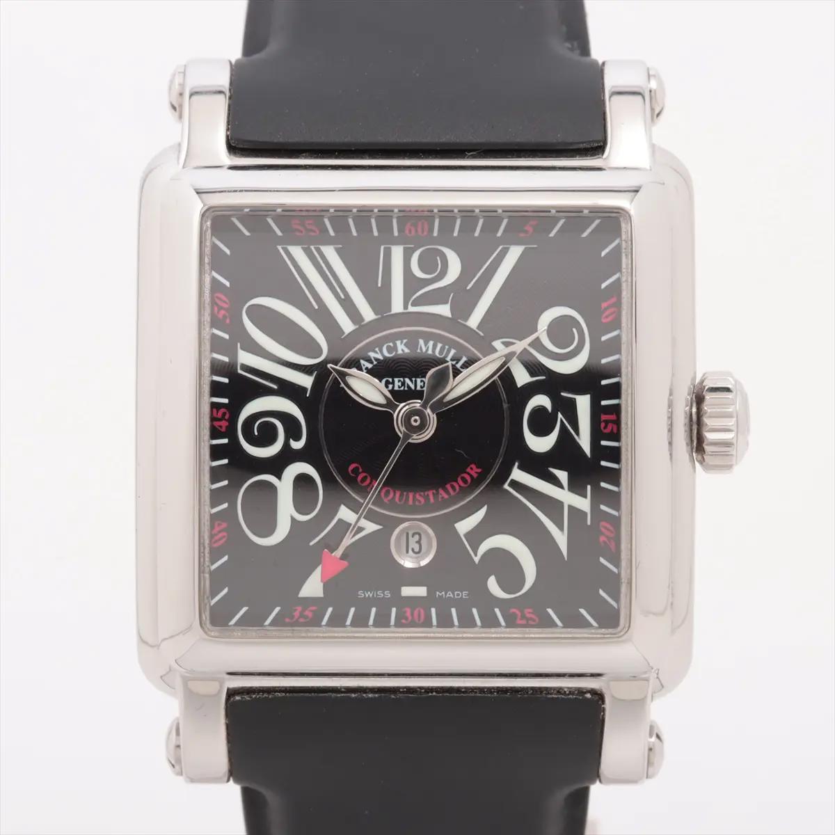 Franck Muller Cortez Conquistador 32mm 10000 L SC , stainless steel, black dial with arabic numerals, date window at 6 o'clock, automatic movement, black rubber strap with tang buckle. Watch comes with original box and 1 year seller warranty.