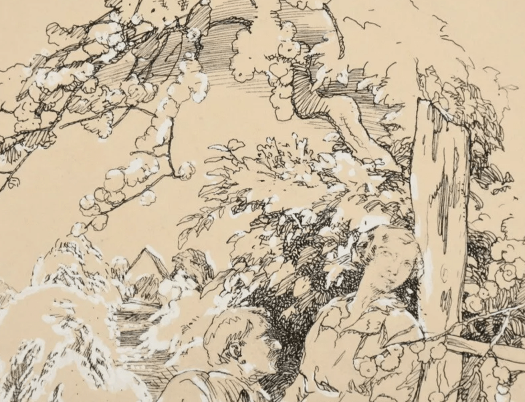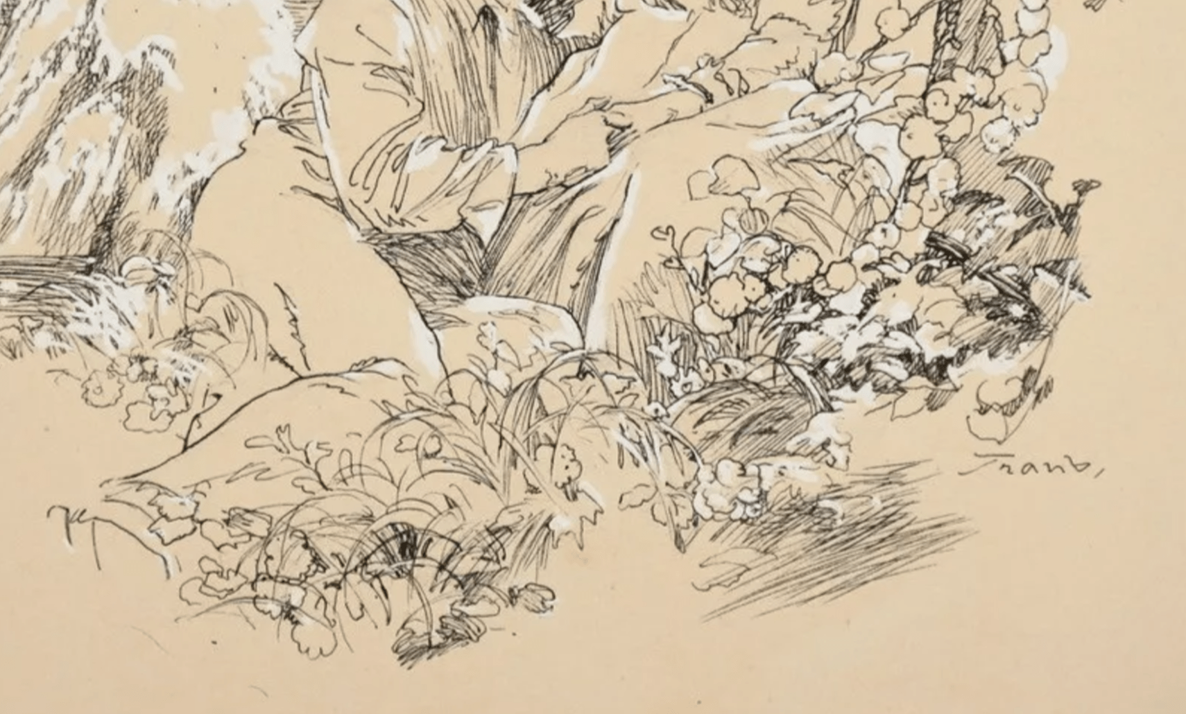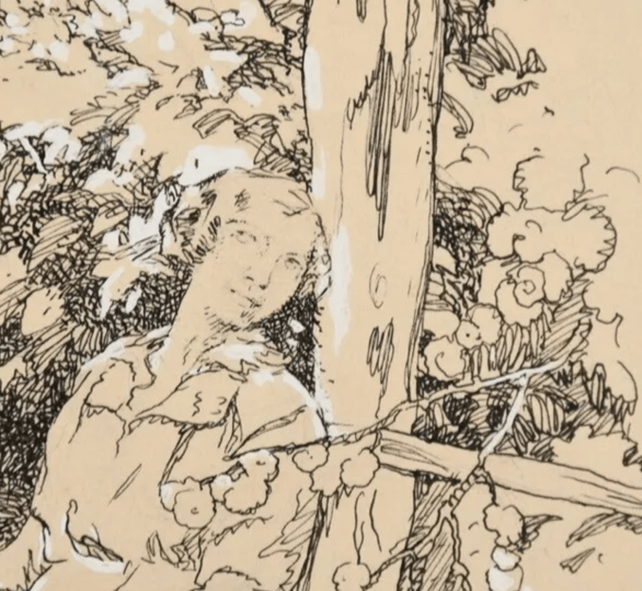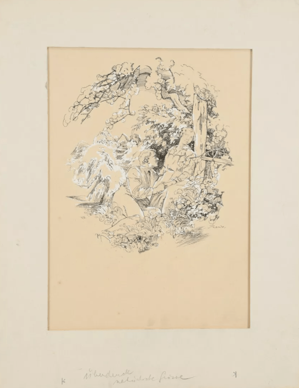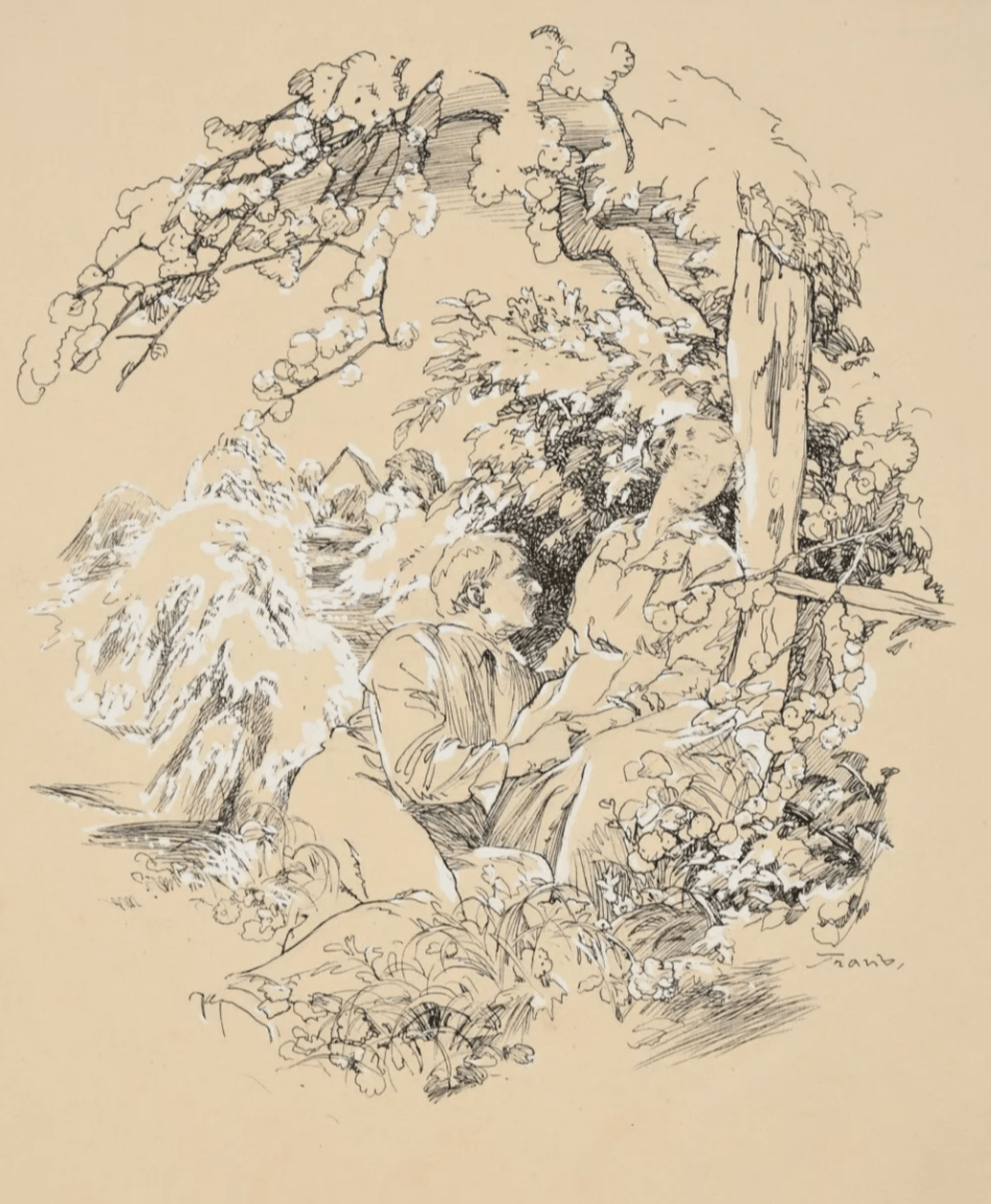 Paar unterm Baum | Federzeichnung von Gustav TRAUB, für die Meggendorfer-Blätter