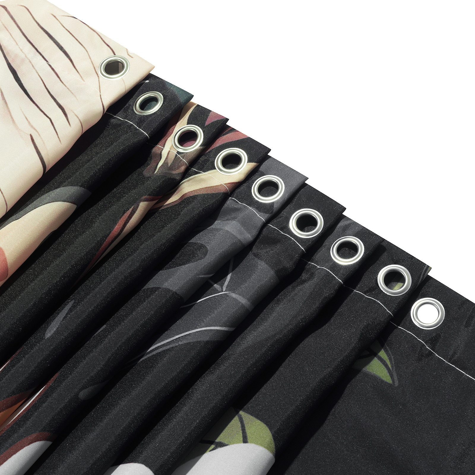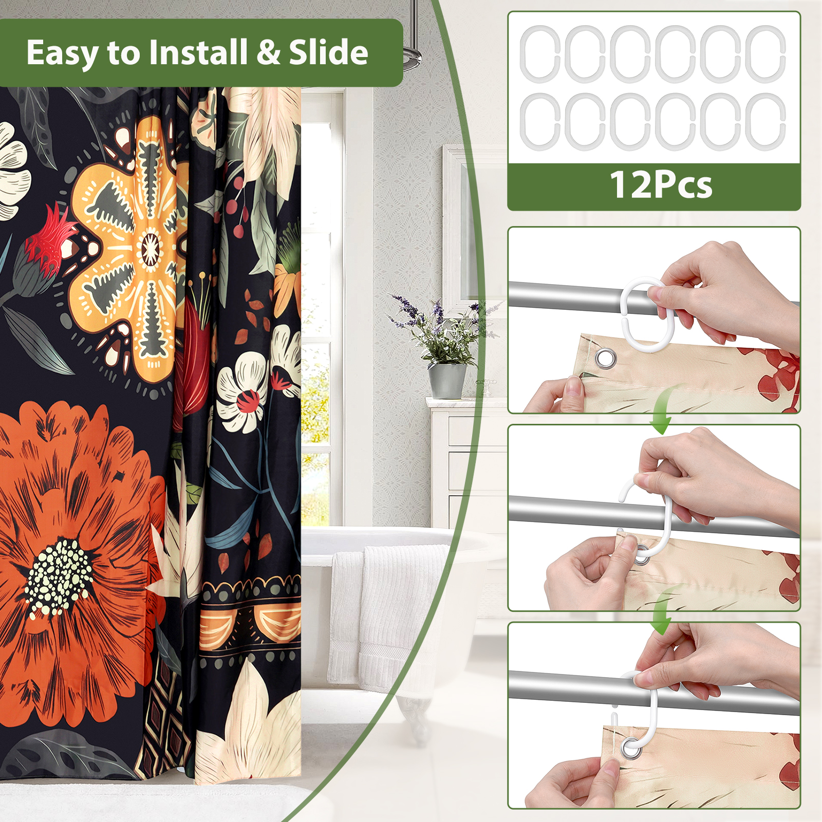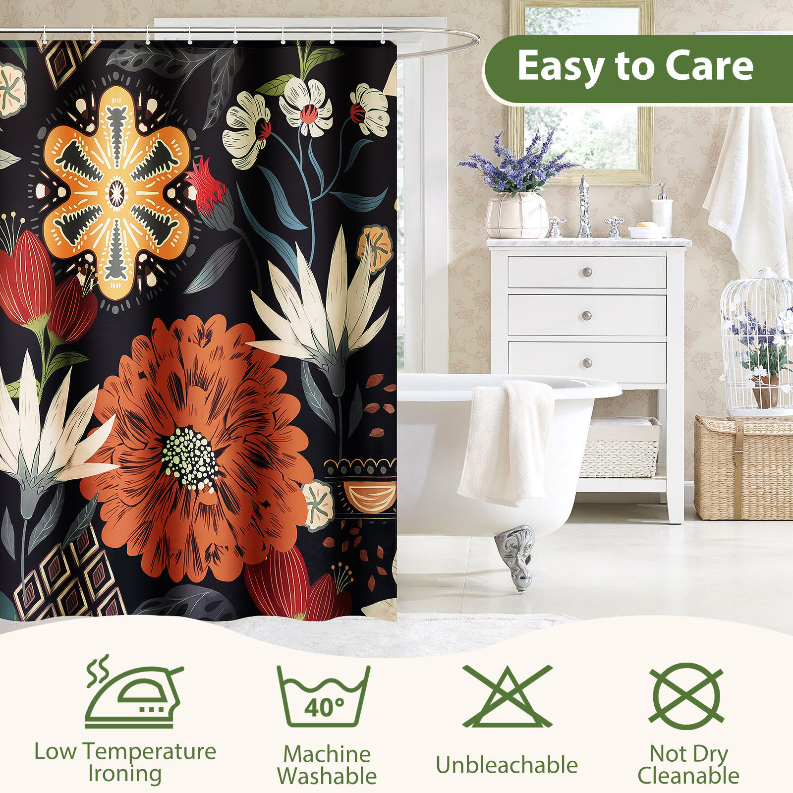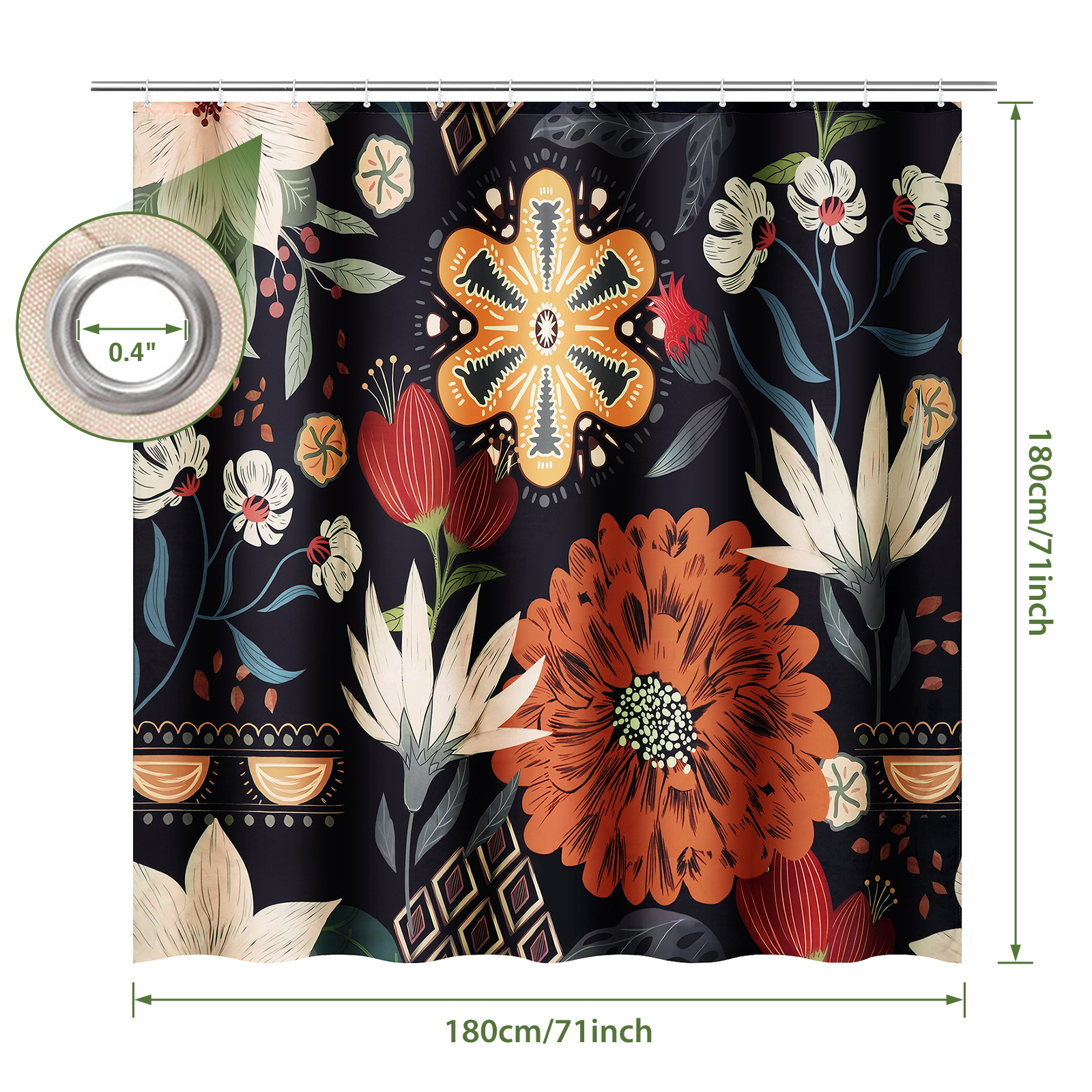 This Beautiful and Colorful shower curtain, Emery, is an eye-catching piece. Shower curtain is white color features multi-color printed floral geometric pattern. Shower curtain size is 71 x 71 inch which is a standard shower curtain size.
