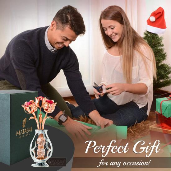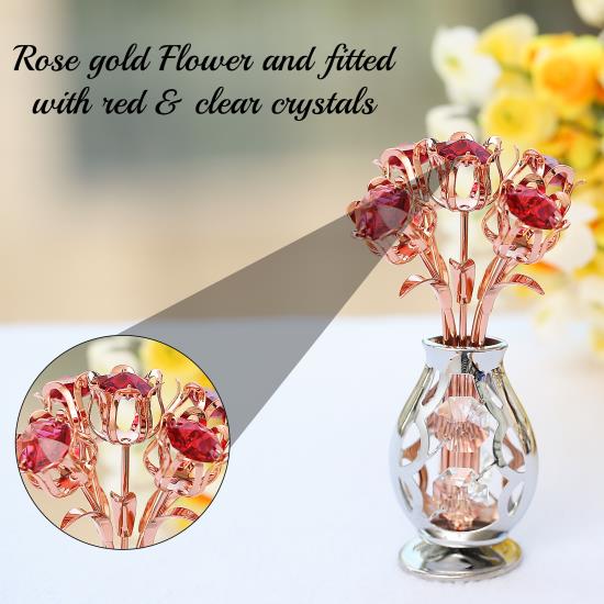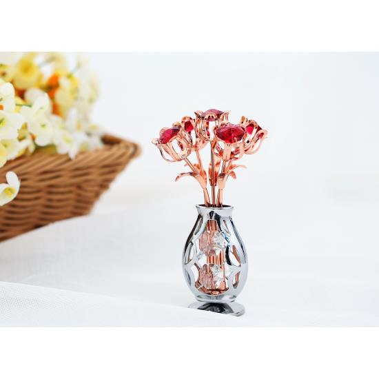 The sturdy, elegant vase and precision flowers are plated with rose gold and chrome and fitted with red & clear crystals
