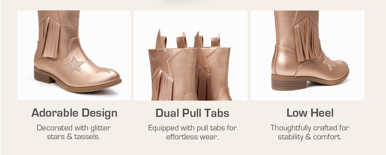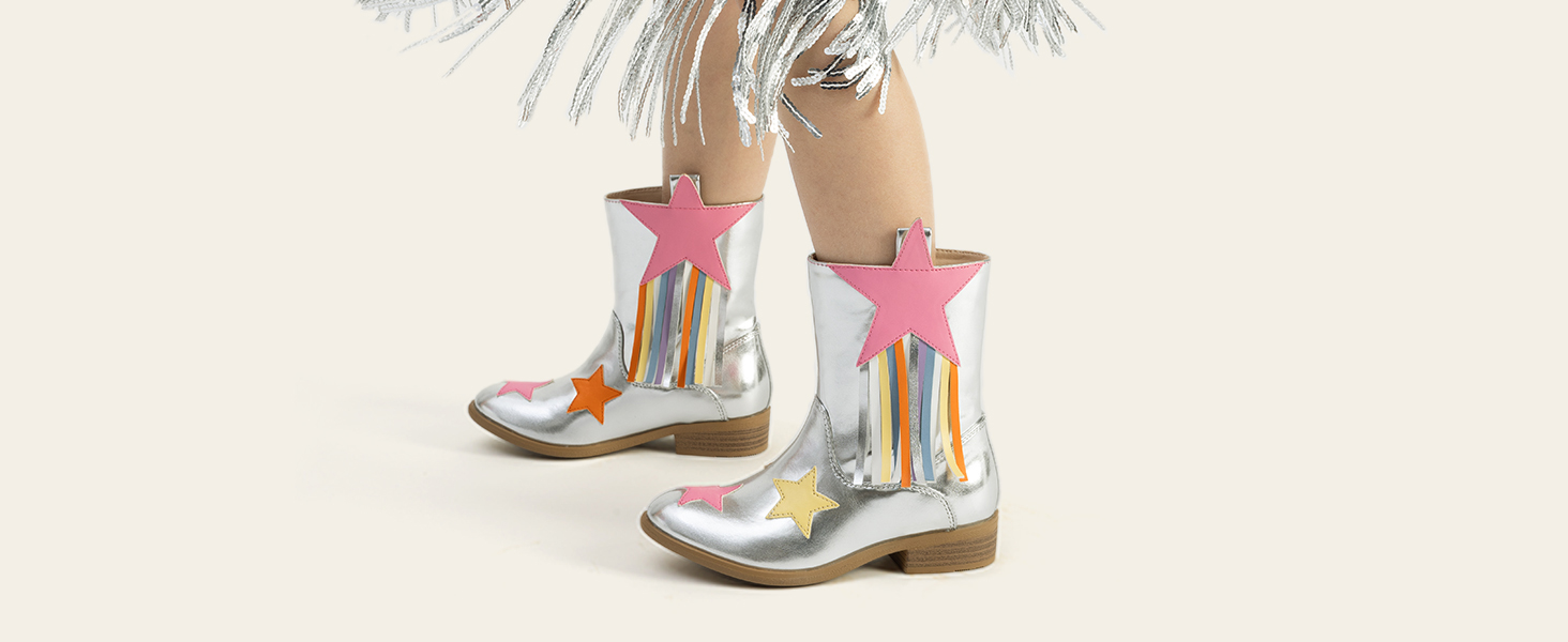 **Stylish Vegan Leather**: Features glittering stars and tassels for a cowgirl look.