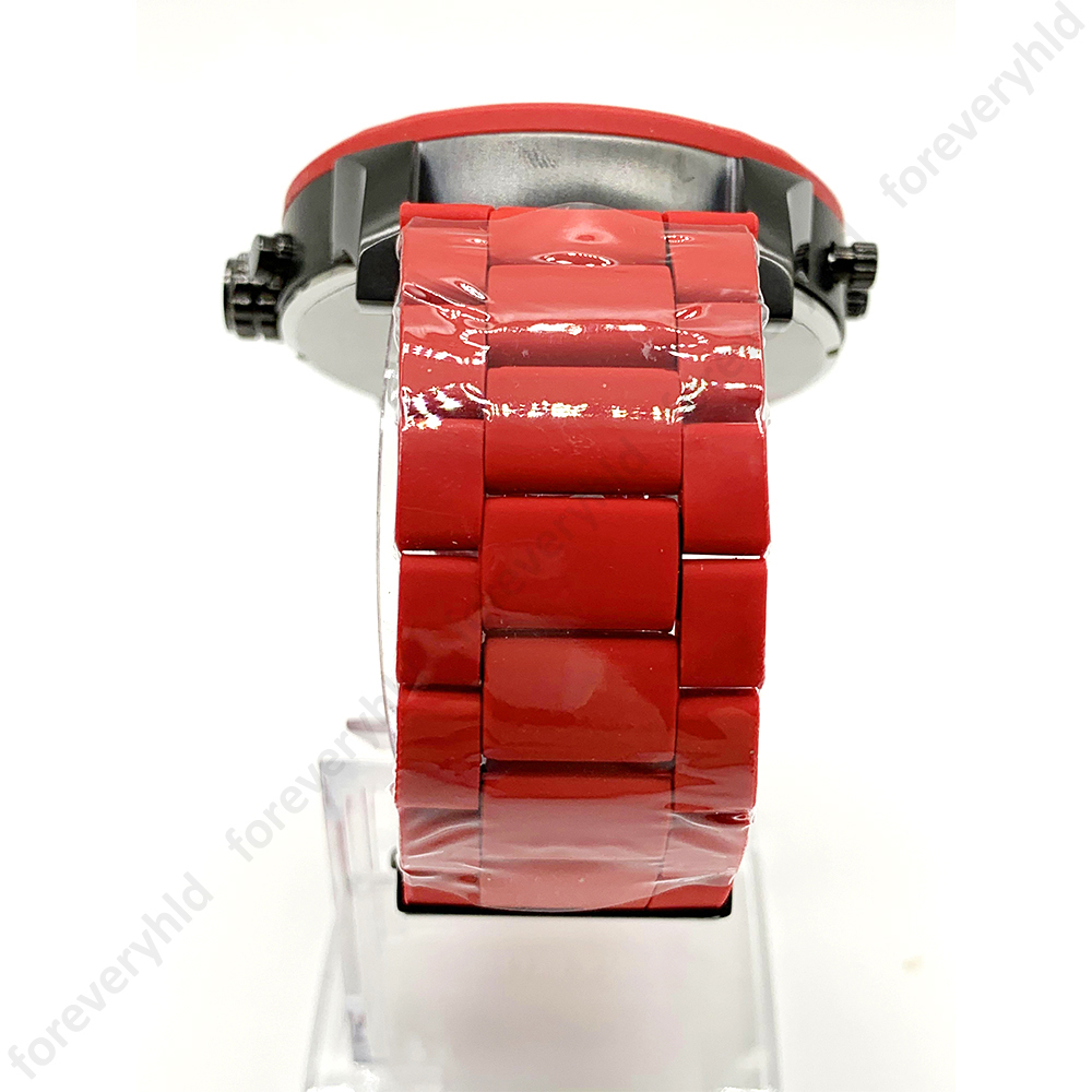 Gunmetal-tone stainless steel case with a red silicone strap strap.