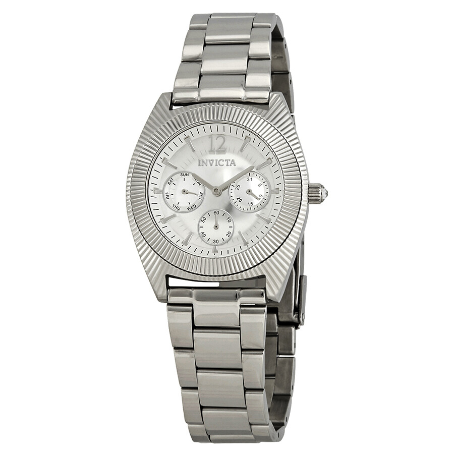 Invicta Women's Watch 25247 Angel Silver Tone Dial Stainless Steel Quartz 39mm (L8074) Product DetailsCaseCase Size38.5 mmCase Thickness13 mmCase MaterialStainless SteelCase ShapeRoundCase BackSolidBandBand MaterialStainless SteelBand TypeBraceletBand ColorSilver-toneBand Length8 inchesBand Width21 mmClaspFold OverDialDial ColorSilverTypeAnalogCrystalFlame FusionHandsSilver-toneDial MarkersIndex- Arabic at the 12 o' clockSecond MarkersArabic Numeral appears at the 12 o'clock position. Minute Markers around the outer rimSub DialsThree - Small Second, Date and Day of the WeekBezelFixedBezel ColorSilver-toneBezel MaterialStainless SteelCrownPull / PushInformationBrandInvictaCollection NameAngelGenderWomensModel25247Watch LabelJapan MovtMovementQuartzEngineHattori Caliber VD75FeaturesWater Resistance100 meters / 330 feetCalendarDate display at the 3 o'clock positionFunctionsDate, Day, Hour, Minute, Small SecondWatch FeaturesChronograph, Stainless SteelStock 9436 |