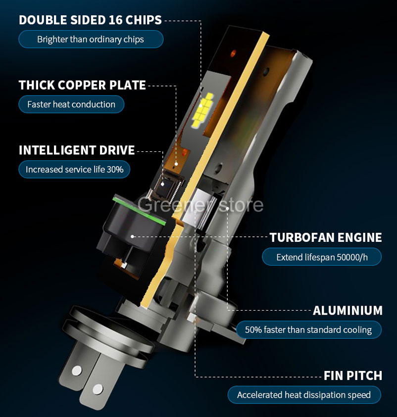【Une durée de vie de plus de 50 000 heures】 Avec un corps en aluminium d'aviation et un ventilateur turbo de refroidissement de 15 000 tours par minute, nos ampoules H7 offrent une capacité de refroidissement exceptionnelle, ce qui garantit une durée de vie plus longue, jusqu'à 50 000 heures.