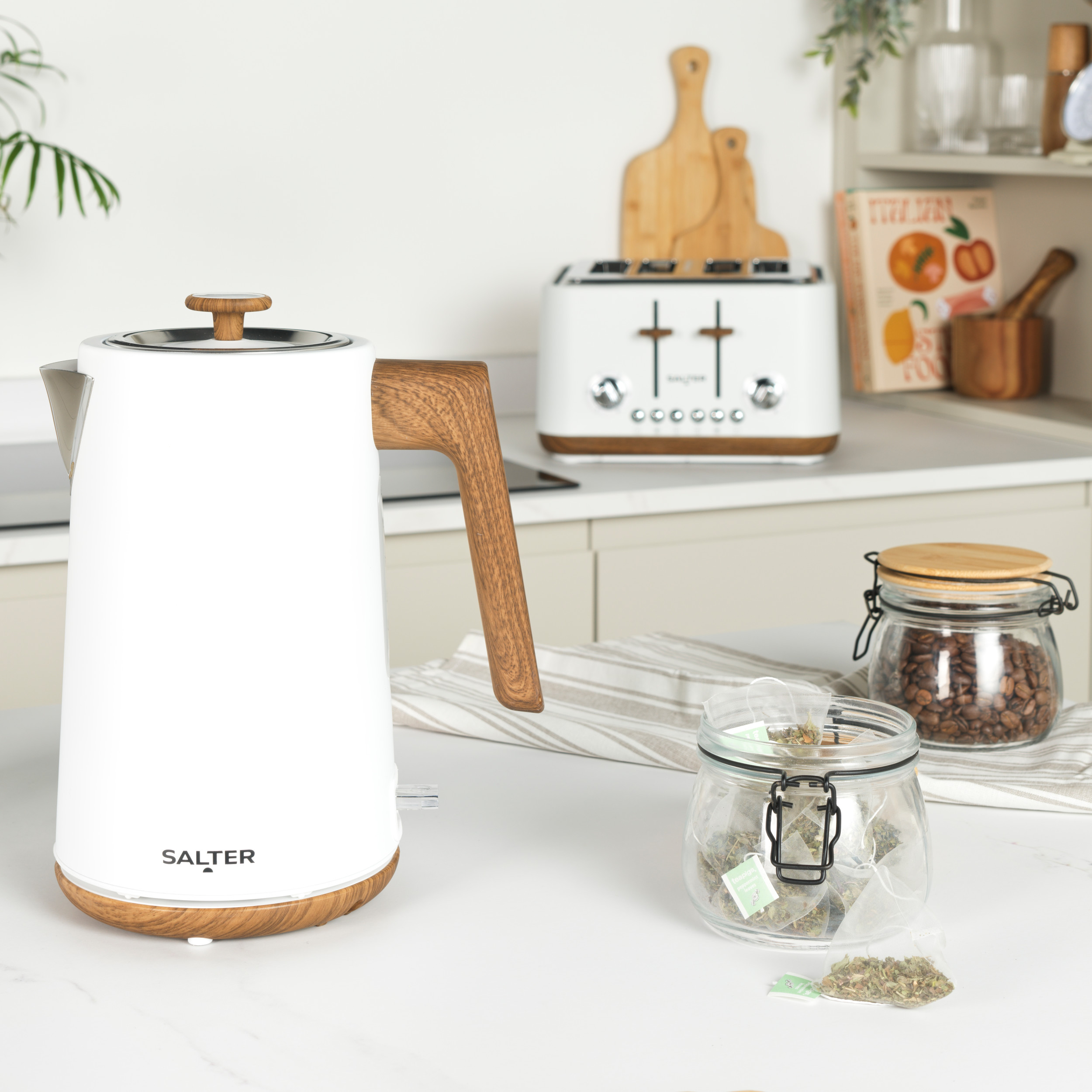 Add a stylish, unique touch to your kitchen worktops with the Salter Toronto Kettle, Toaster, Canister and Microwave Set, featuring a sleek, white design with wooden-effect accents. Including 3 canisters and bread bin, keep your countertop clean and tidy! With 8 auto cooking presets, the microwave has a generous 20L capacity to prepare various dishes with ease! This kettle features a water level indicator, a 360° base and a boil-dry sensor with auto shut-off for added safety. The toaster features extra-wide slots that allow you to easily fit thick slices of bread, crumpets, and bagels.