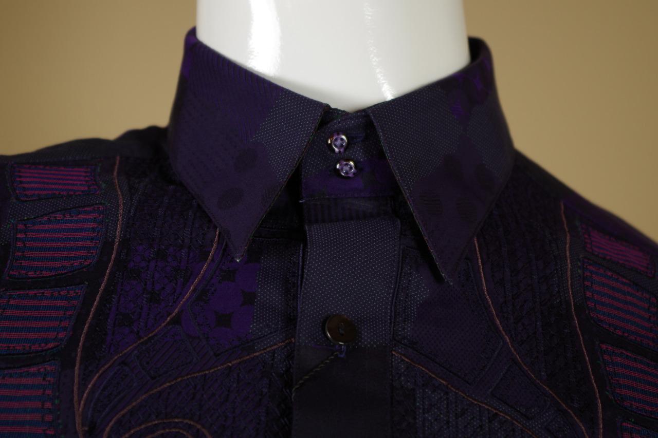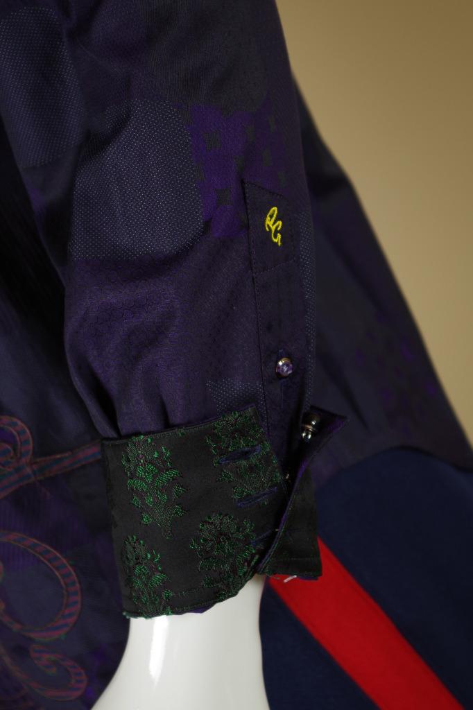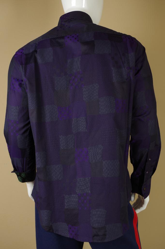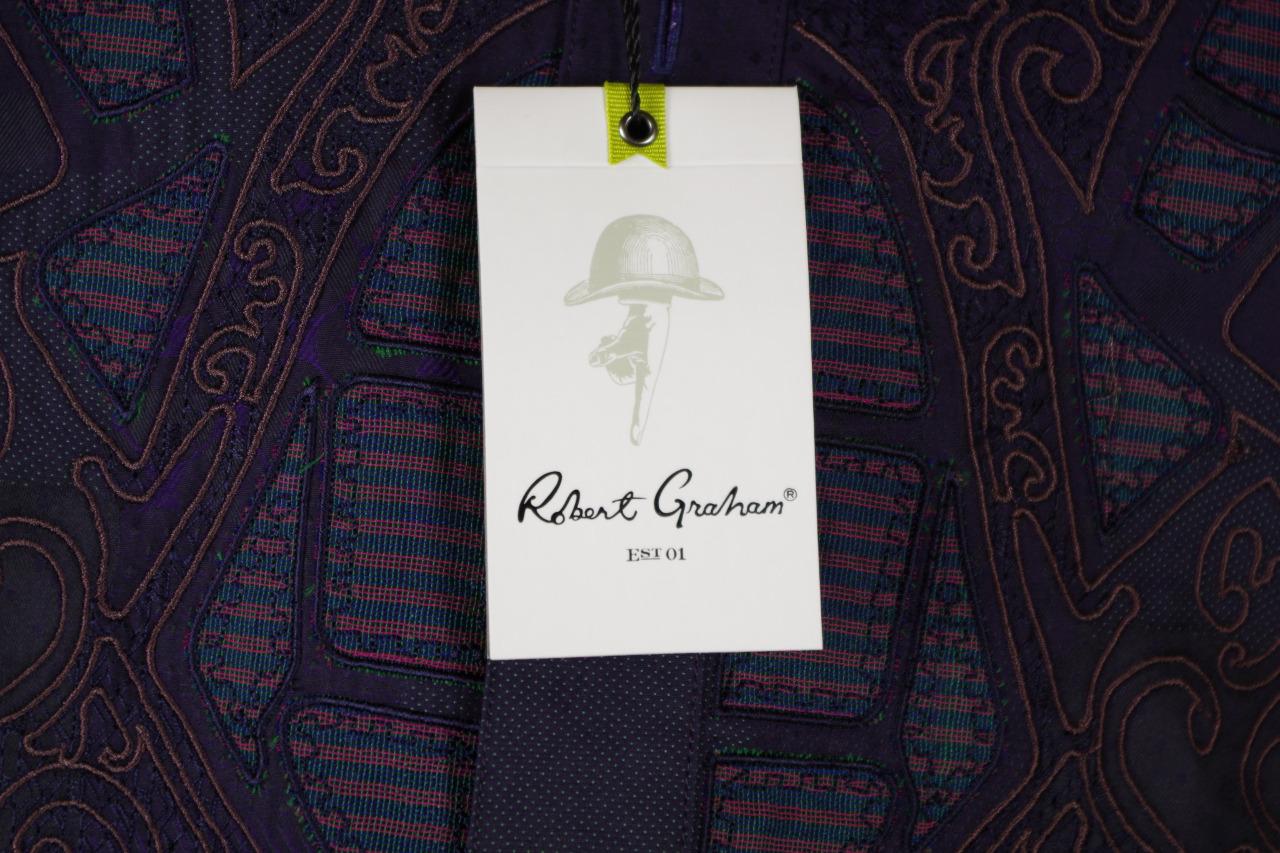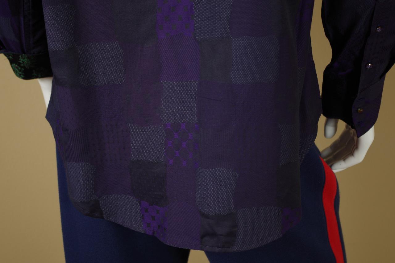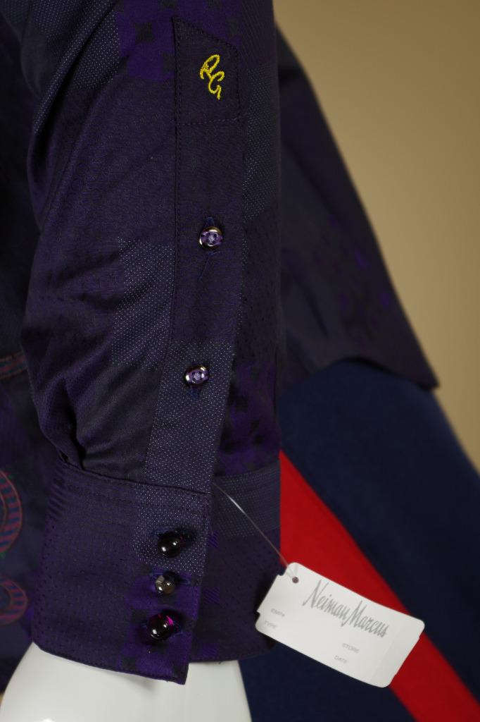 Details: One of my ever favorite Robert Graham Shirts. This is a limited edition shirt that was only made for Neiman Marcus. It is very difficult to find and is individually numbered #381 out of 434 total shirts made. The cuff buttons are half globe purple and clear glass and the reverse cuff is gorgeous. I find the design to be spectacular in pattern, but somewhat subtle in color. Personally, I love it. This shirt is tailored in Robert Graham's Classic Fit.