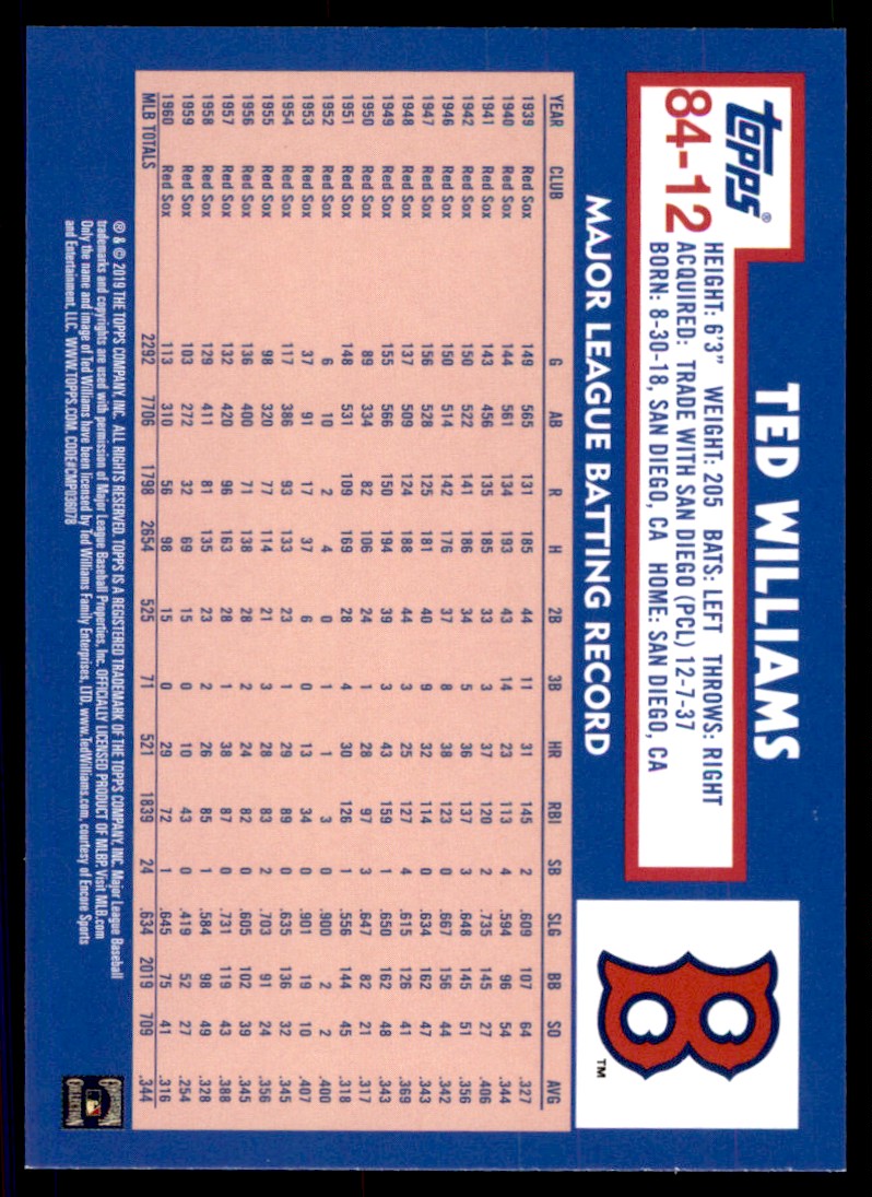 | 2019 Topps Update 1984 Baseball Ted Williams Boston Red Sox #84-12 |