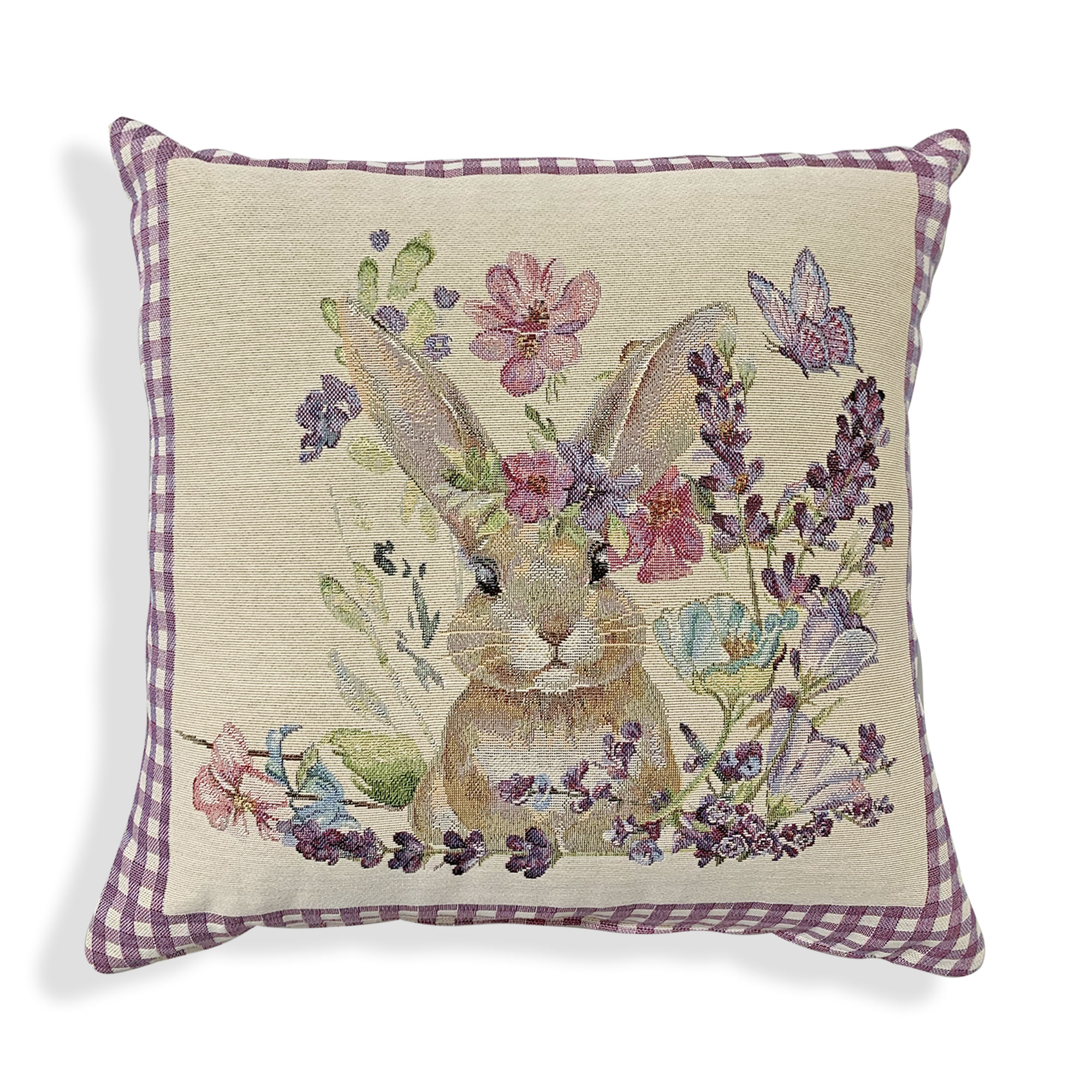Il cuscino è realizzato in cotone di gobelin di alta qualità ed è perfetto per creare un'atmosfera accogliente e festosa durante le feste di Pasqua grazie alla fantasia presente su entrambi i lati del cuscino con conigli, farfalle, fiori e bordo in vichy.