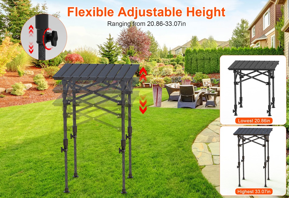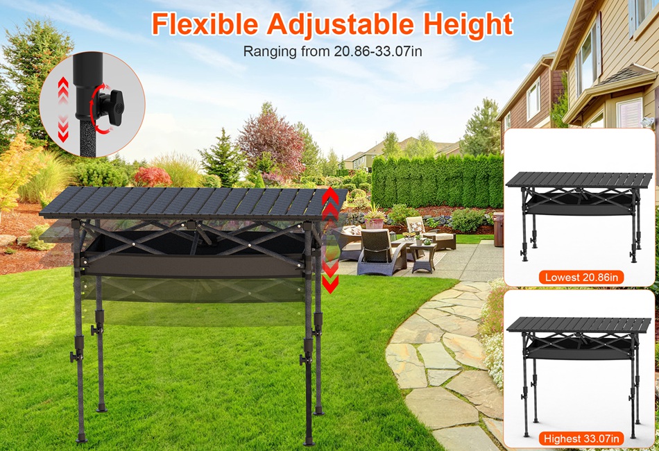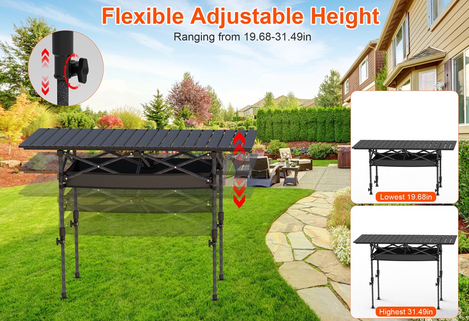 - Height Adjustable Camping Table:Unique adjustable height ranging from 20.86-33.07in for M-size table and 19.68-31.49in for L-Size table,adapts to diverse chairs and stools,allowing you to effortlessly find the ideal setting for various activities such as dining,cooking,or playing games. Caution:It is not advisable to pull it to an excessive height due to potential shaking issues. Please set it at an appropriate height for stable usage.