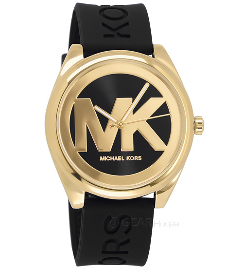 Featuring durable stainless steel construction with a luxurious gold finish, this women's 42mm 'Janelle' silicone watch from Michael Kors is a great choice for everyday wear. This attractive timepiece features a black dial with a 3-hand movement and a large gold mirror MK logo at the center. Plus, the watch is fitted with a soft silicone strap for a sleek look and a more comfortable feel. Brand new with box. Guaranteed authentic. MSRP: $250.