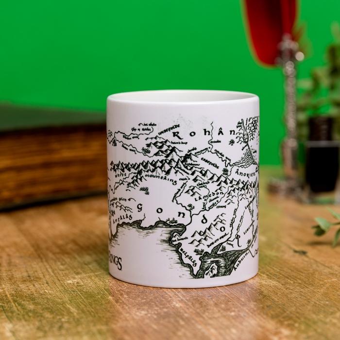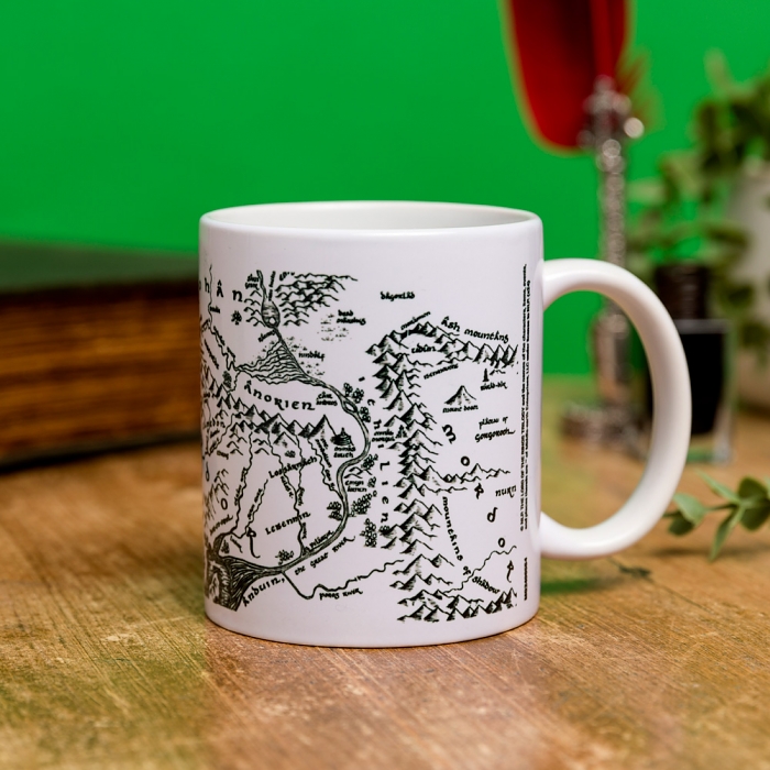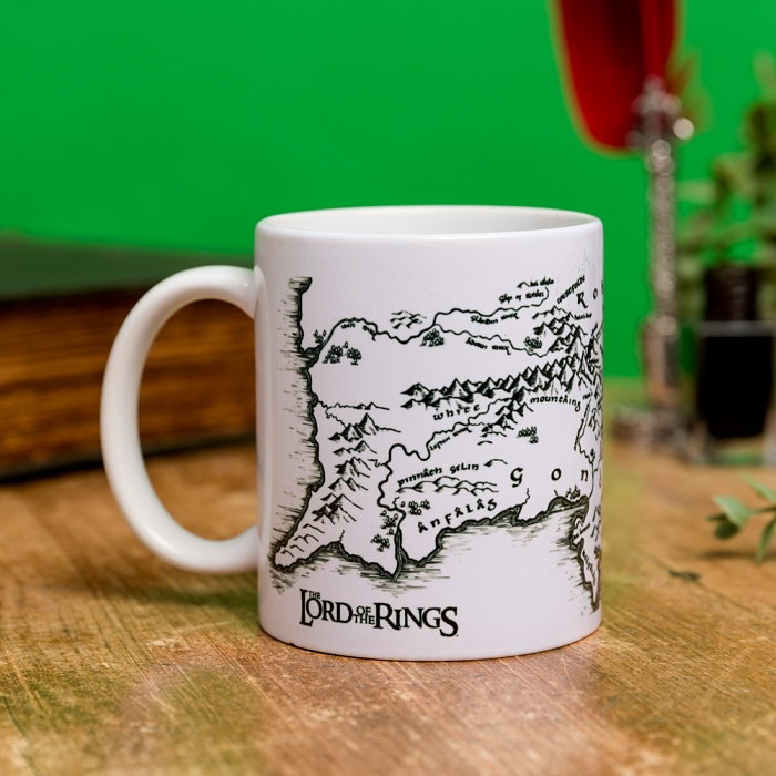 Lord of the Rings Middle Earth Map Mug Here's a mug that's perfect for all weary Hobbits of the Shire travelling through Middle Earth when they need to stop for a tea break! Designed in-house here at TruffleShuffle HQ, this epic Lord Of The Rings mug features a simple monochrome illustration of the iconic map of Middle Earth from J.R.R Tolkien's classic books and Peter Jackson's Oscar-winning films. Put the kettle on and replenish yourself with your favourite warm beverage before you continue your quest to destroy the One Ringâ¦