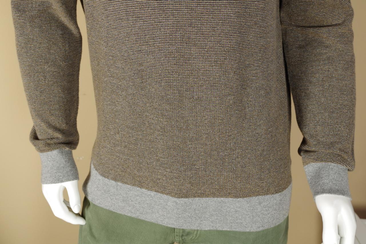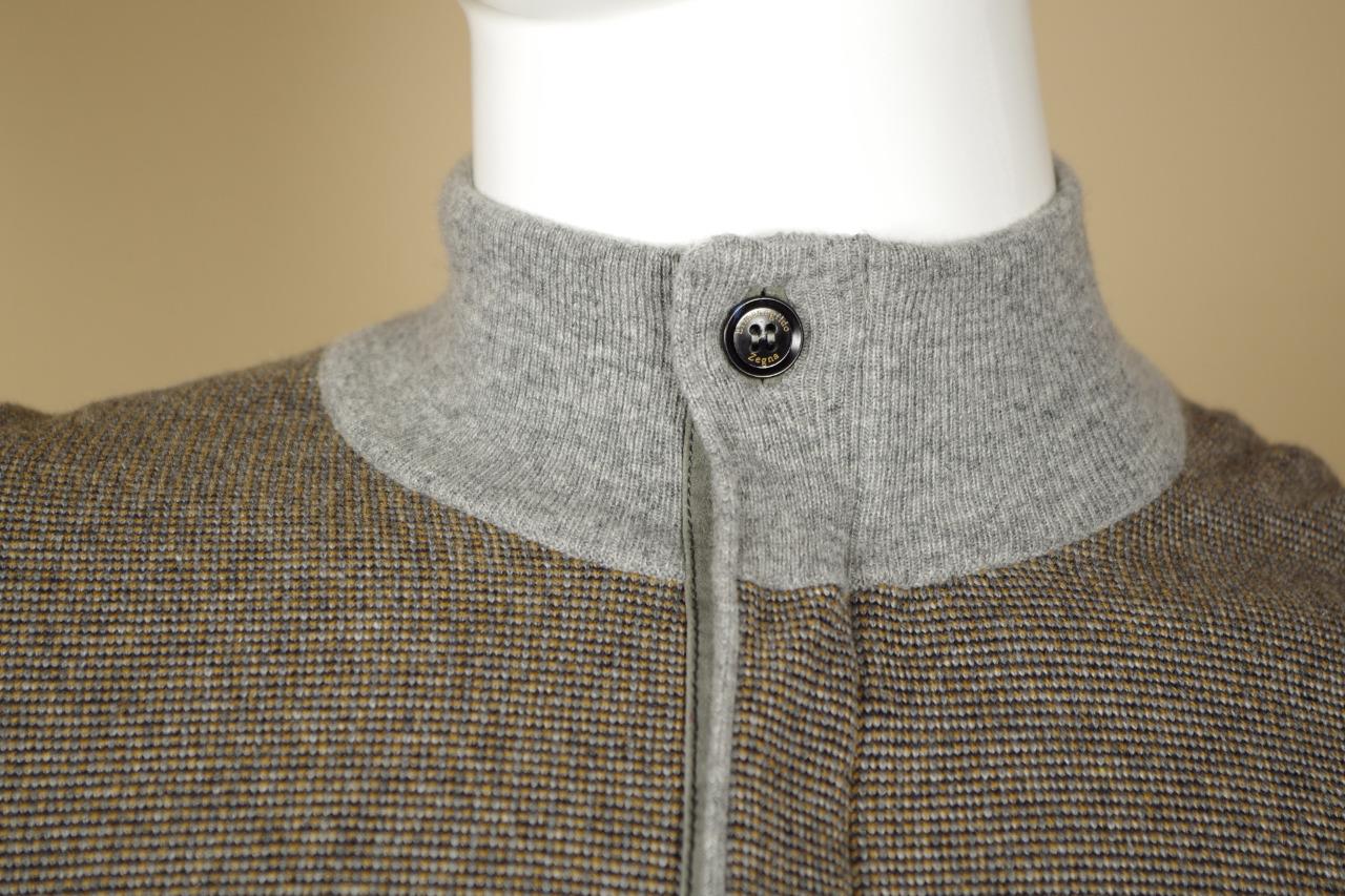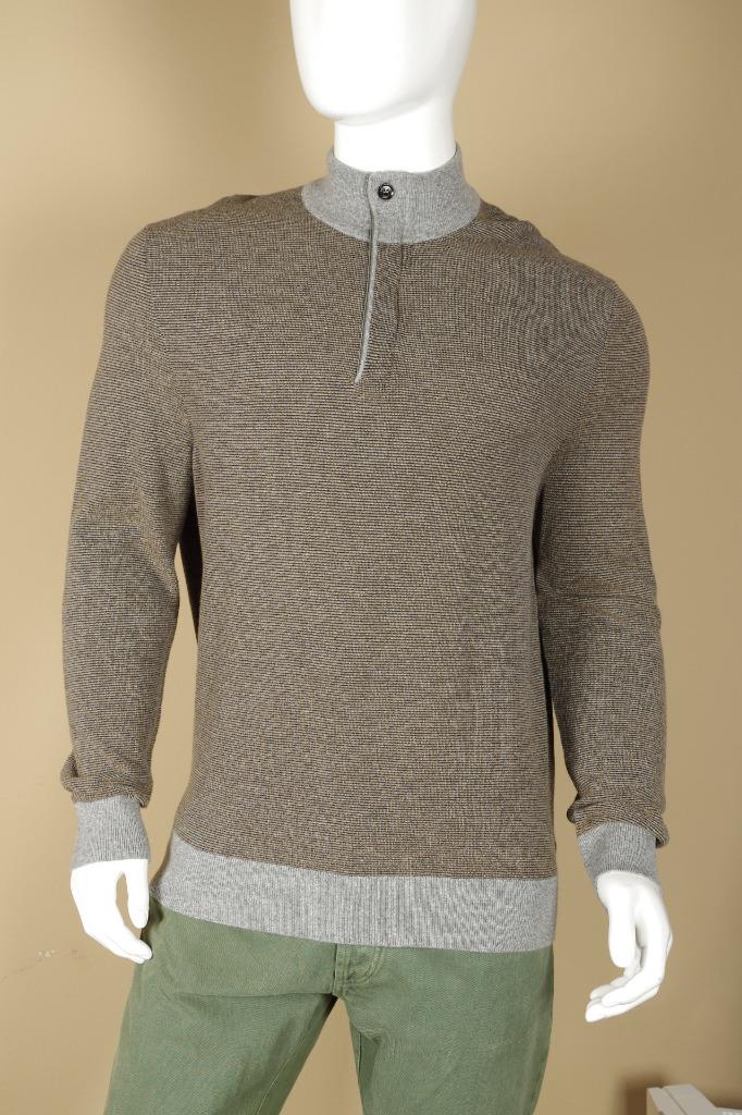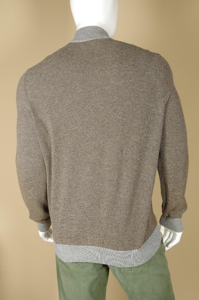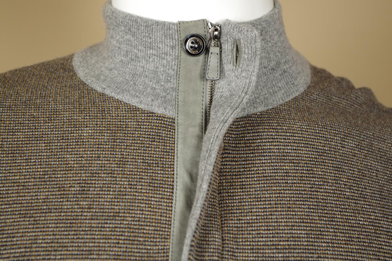 Details: Cashmere and Cotton Blend 1/2 Zip Cardigan, Leather Trim, Leather Zipper Tab Pull, Multi-Color, Base of Brown with Orange and Black Flecks with Gray Trim, Ribbed Collar, Cuff and Hem.