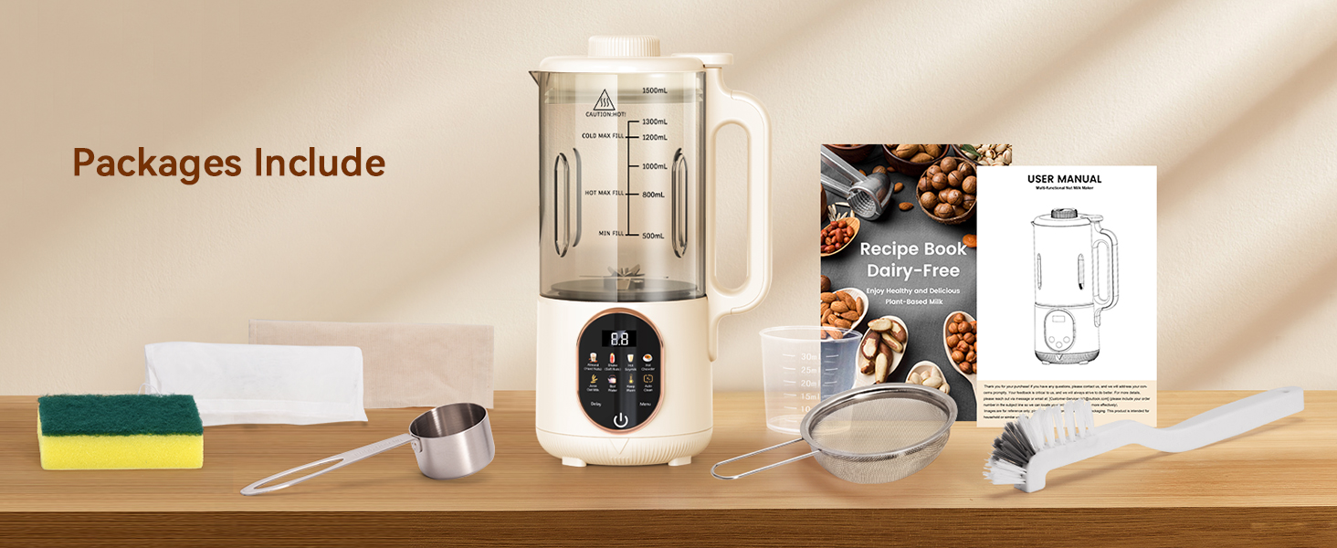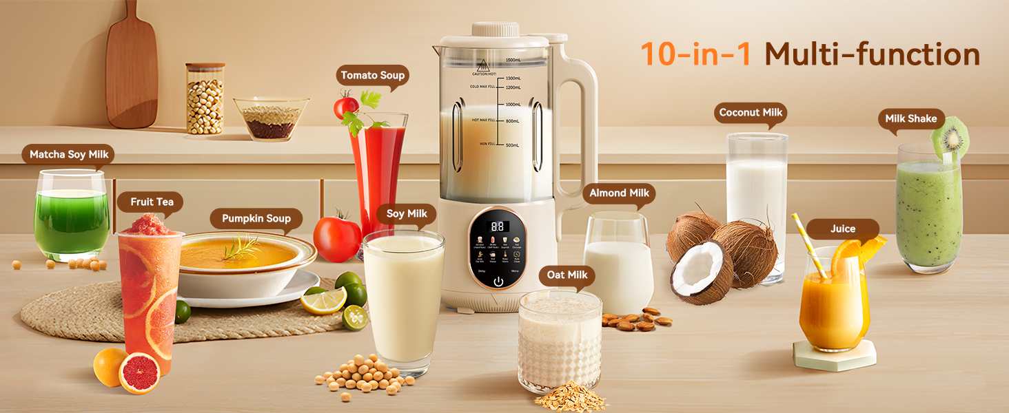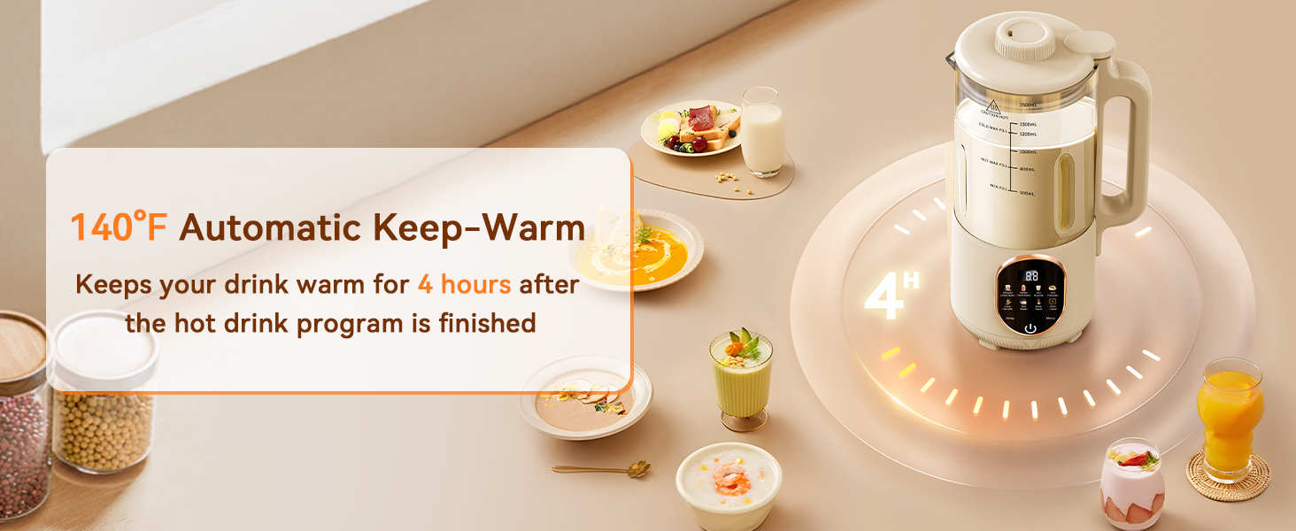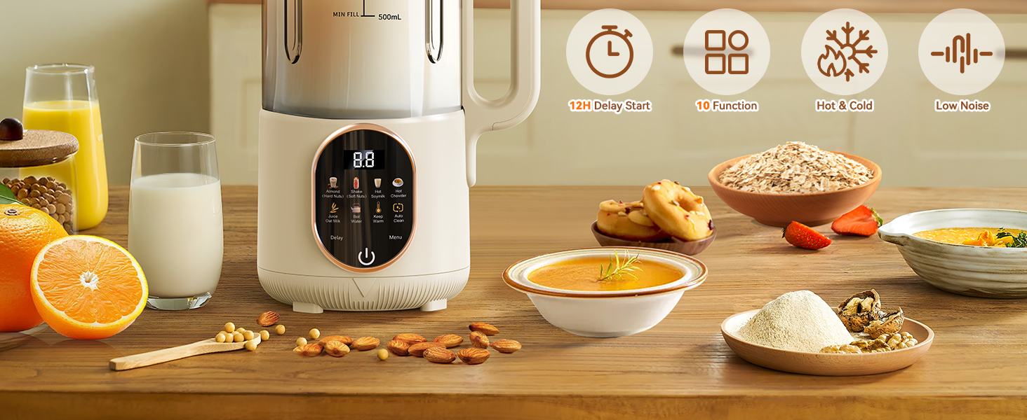 10 in 1 Milk Machine Maker:nut milk machine also has Boil Water, Keep Warm (Up to 4hrs) and Delay Start (Up to 12hrs) functions. The Nut Milk Maker can be used to make a variety of plant-based milks, including almond milk, cashew milk, coconut milk, multigrain milk and beverages such as juices, rice paste, coffee and tea. take one to help you build healthy diet