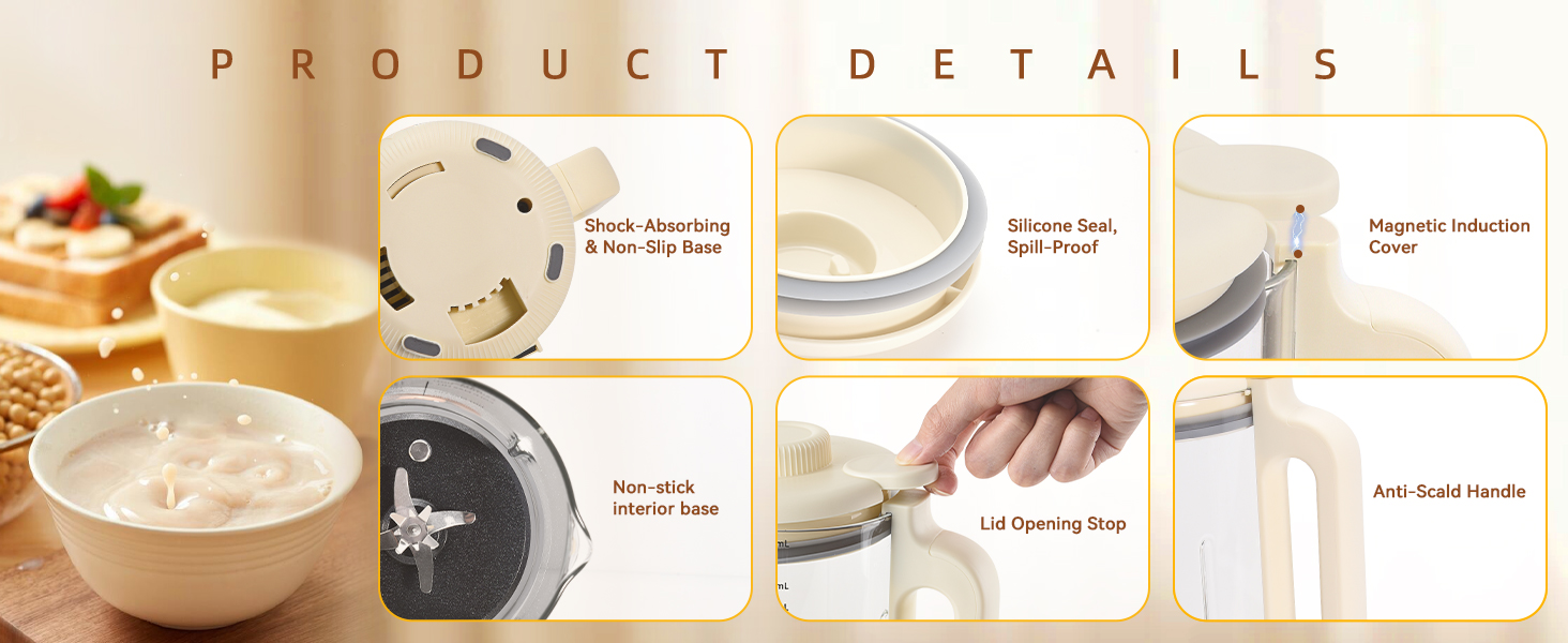 1.5L/50oz Family Size Soy Milk Maker - 1.5L/50oz large capacity milk maker is perfect for serving the entire family while saving countertop space. Serving 4-6 cups at one time.Offers a low-noise soundproof design, you have the freedom to customize milk for breakfast every day