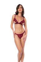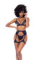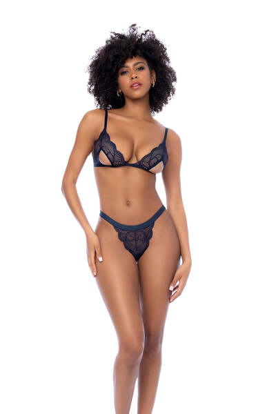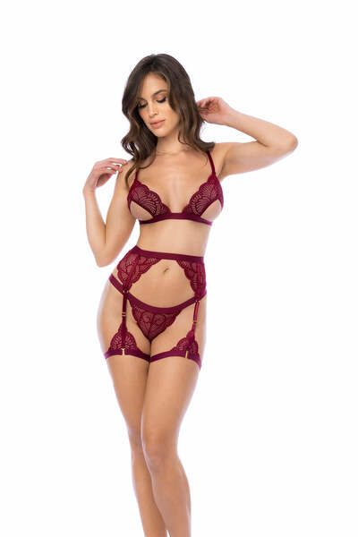 Three pieces of goddess-level beauty. The contemporary lace and semi-open cups create a three-piece set that is as modern as it is seductively beautiful.