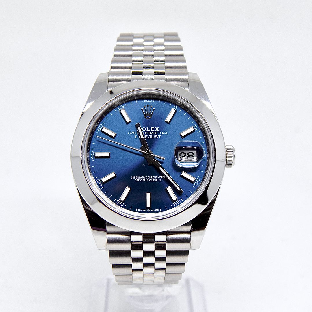 This is a Rolex Datejust 41 126300 with Box and Papers from 2024. This watch is in brand new/unworn condition. It has a 41mm Steel smooth bezel and a blue baton dial. This watch has a Steel Jubilee bracelet. This watch is under Rolex warranty till 2029.