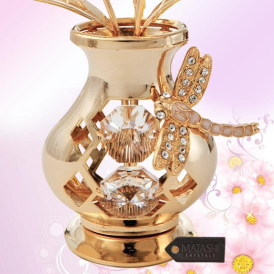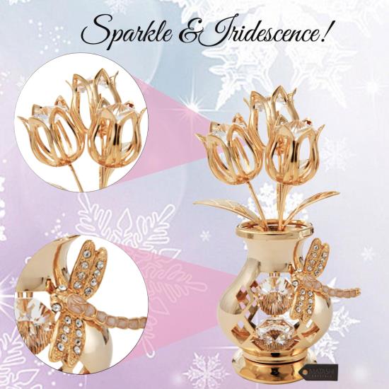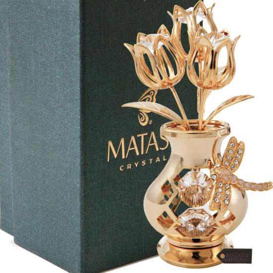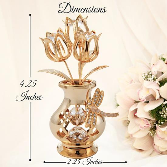 One 24K Gold Plated Tulip Vase –dragonfly Table Top Ornament made with Matashi® Crystals! Tabletop ornament stands on its own. Dimensions: 2.25 (L) x 4.25 (H) x 1.5 (W) Inches. Great gift for Birthday, Valentines Day, Anniversary and more! Covered by a 2 year limited warranty by Matashi® Warranty card with all necessary guidelines included in the box. Includes an elegant, business size gift card which can be completed to make your gift unique.