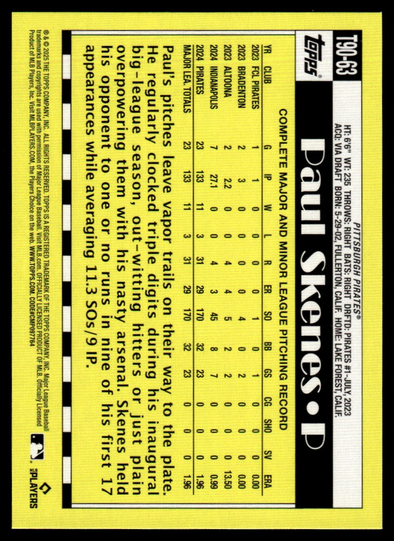2025 Topps Series 1 Paul Skenes 35th Ann.1990 Parallel #T90-63