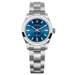 The Rolex Oyster Perpetual 31, reference 277200, is a vibrant and versatile timepiece that combines Rolex's iconic craftsmanship with a modern aesthetic. This model features a 31mm stainless steel case with a polished finish, paired with a striking blue dial adorned with luminescent hour markers and hands, ensuring excellent readability. The clean and minimalist design is complemented by a smooth bezel, offering a timeless and understated look. Powered by the Rolex Calibre 2232 self-winding movement, it offers a 55-hour power reserve and exceptional precision. The watch is fitted with a robust Oyster bracelet, featuring the Oysterlock safety clasp for a secure fit. The timepiece is in pristine condition and comes complete with its original box and papers. Message or call for any inquiries.