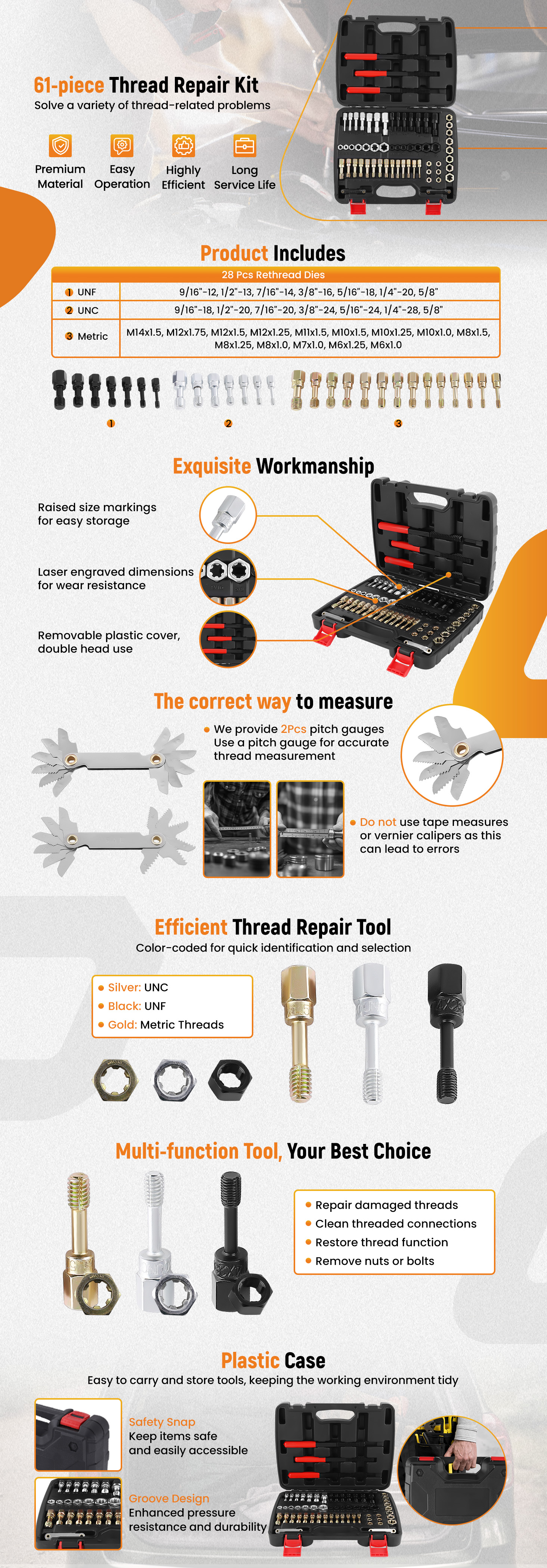 2. Color Coding for Thread Types: To facilitate easy identification, rethreading tools are color-coded. Silver denotes UNC threads, black for UNF, and gold for Metric threads, aiding quick visual differentiation in various applications.