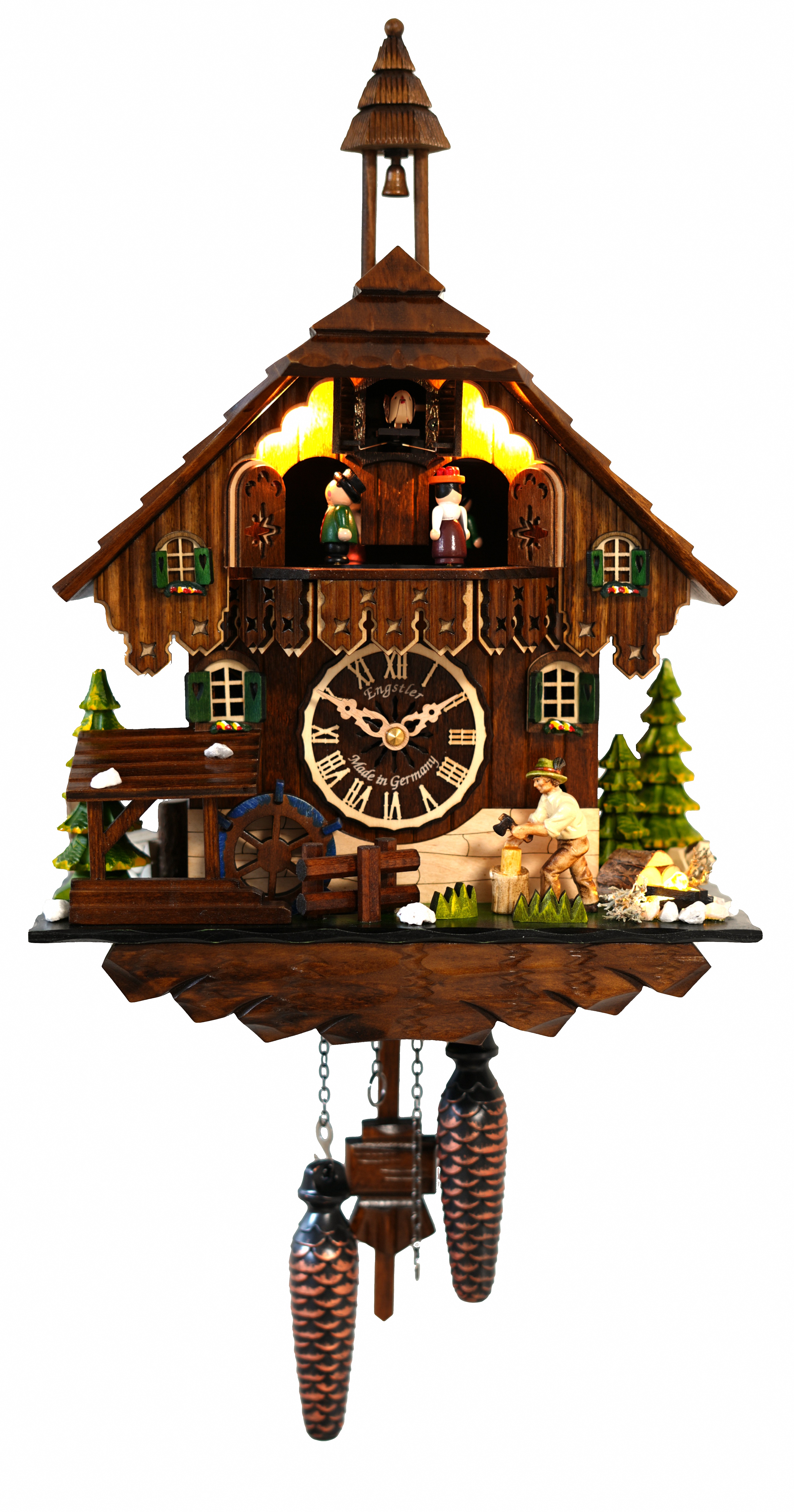 Quartz Cuckoo Clock Black Forest house with moving wood chopper and mill wheel, with music NEW