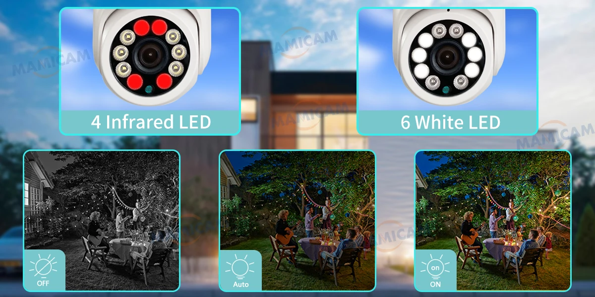 With 4PCS Infrared lights and 6PCS white lights, Infrared night vision is up to 30m, it can provide you with colorful and high-definition image effects no matter day or night.
