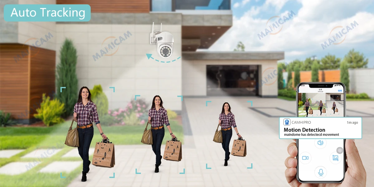 With advanced AI auto tracking technology, After locking the target, the camera will adjust the pan/tilt rotation automatically. Tracking moving objects, cars, pets, human.