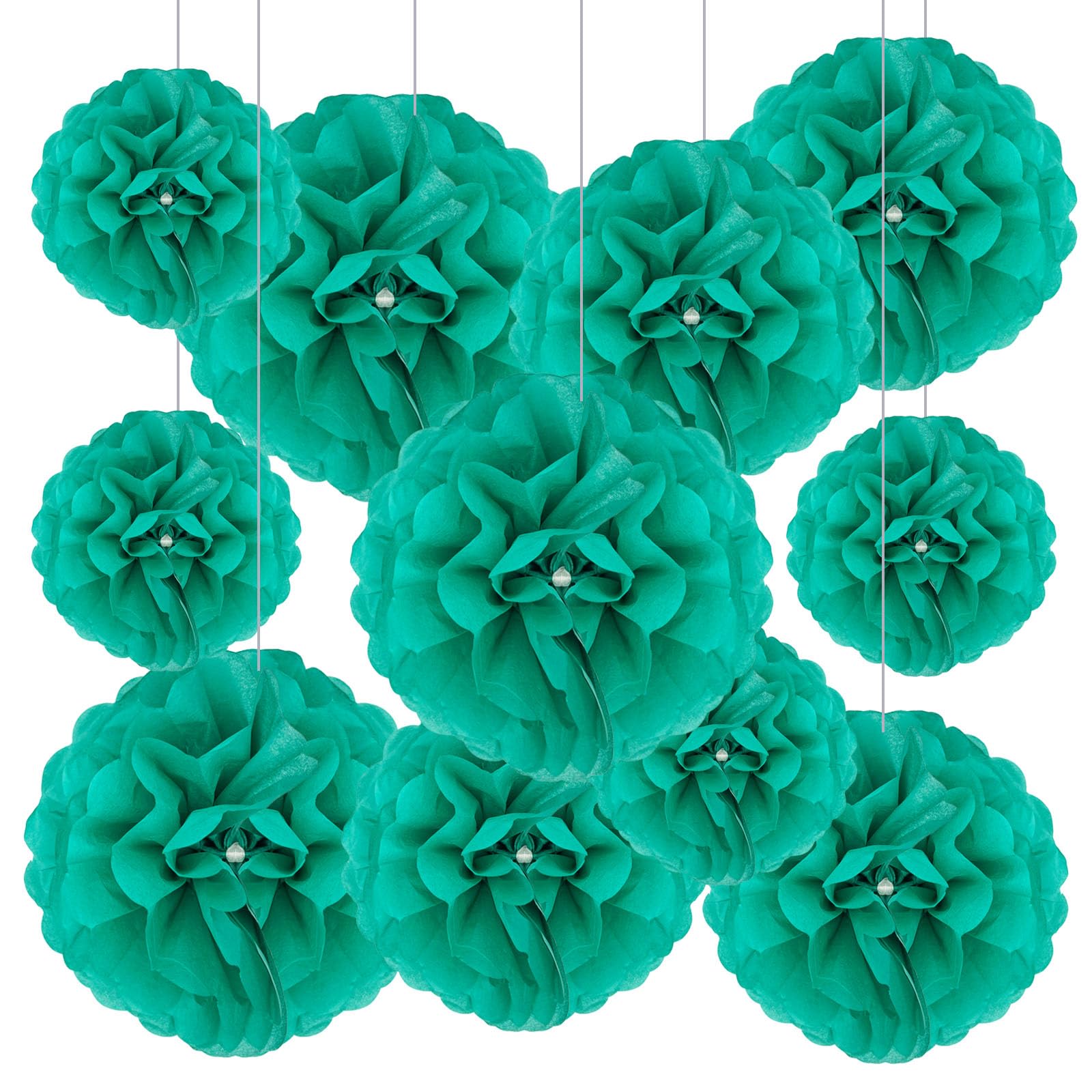 - 【Large Set】20 Pieces emerald green paper flower balls 6 of 6-inch, 6 of 10-inch, 5 of 12-inch, and 3 of extra-large 14 inch paper pom pom flowers.