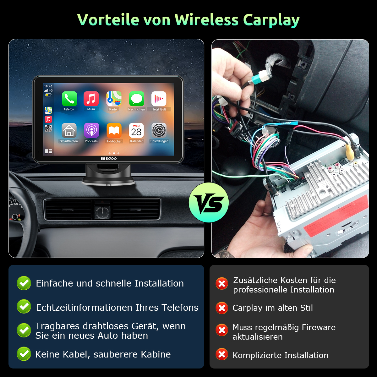 Tragbares 7-Zoll-Autoradio, integriertes Apple Carplay und Android Auto. Nach der ersten erfolgreichen Verbindung kann es automatisch erkannt werden. Erleichtern Sie den Zugriff auf Ihre Telefonfunktionen wie Musik, GPS-Navigation, Sprachsteuerung, Anrufe, Benachrichtigungen, Nachrichten und vieles mehr.