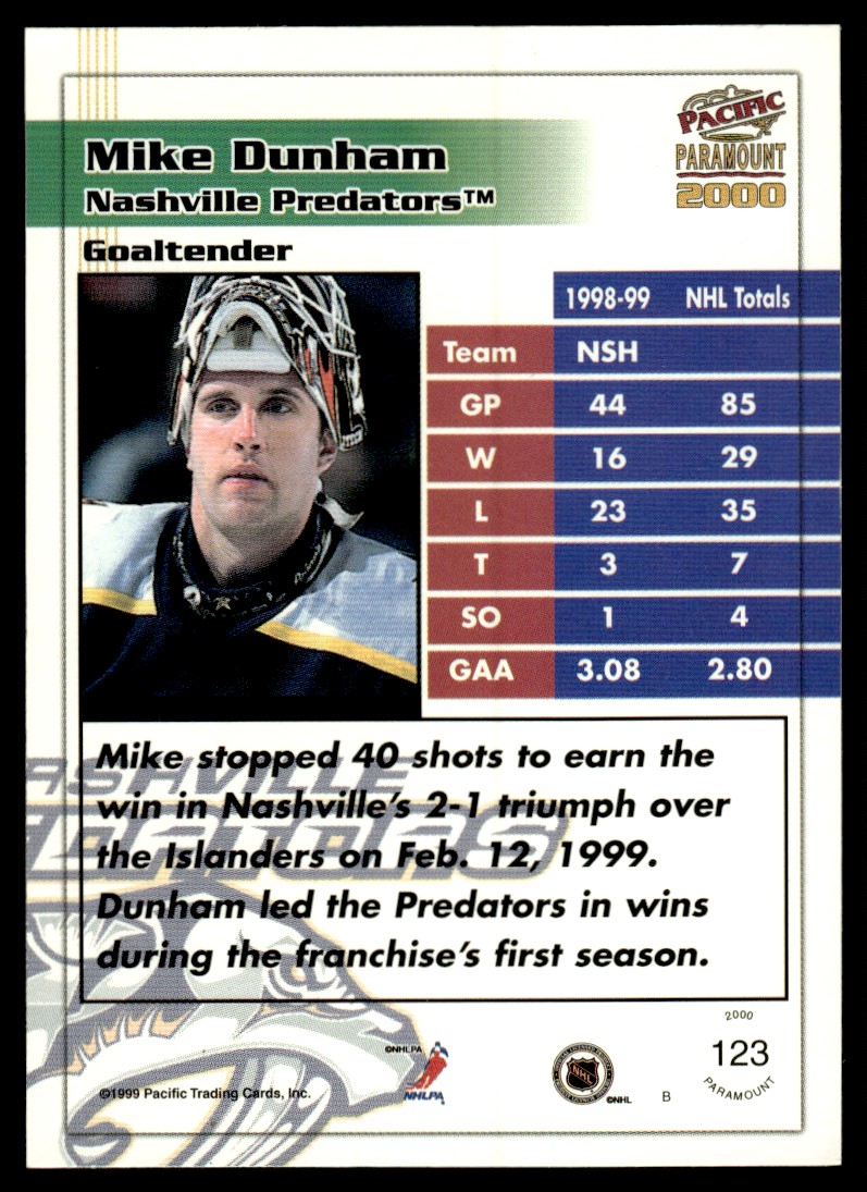 | 1999-00 Pacific Paramount RED Mike Dunham Nashville Predators #123 | ||||||||||||||||