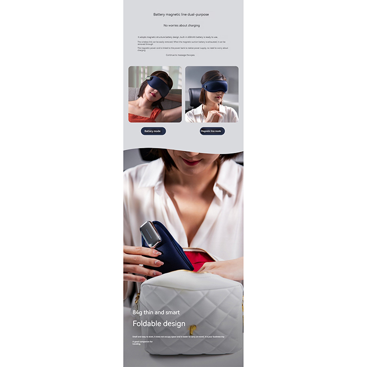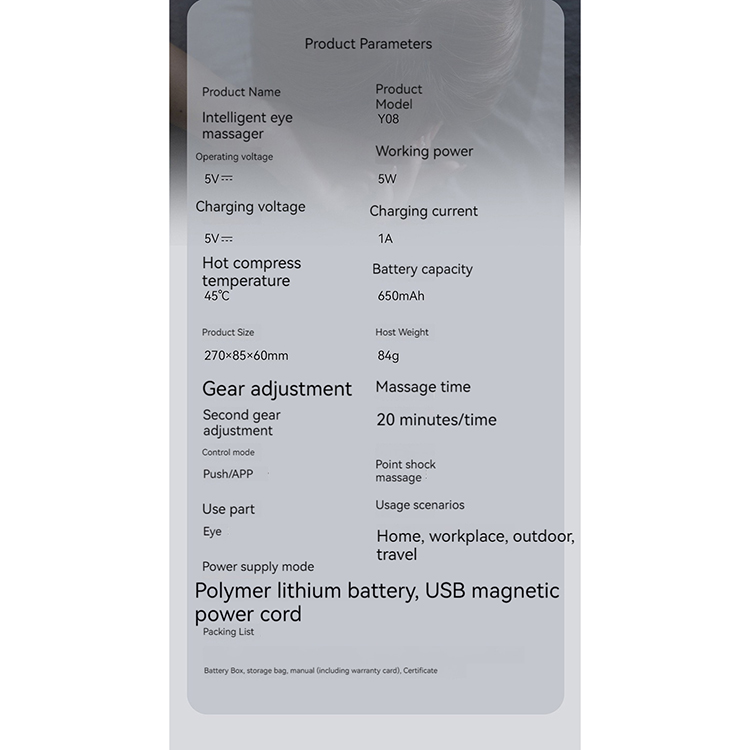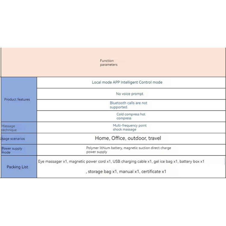 l Eye Massager x1 + Magnetic Power Cord x1 + USB Charging Cable x1 + Gel Ice Pack x1 + Battery Case x1 + Storage Bag x1 + Instruction Manual x1 + Certificate of Conformity x1