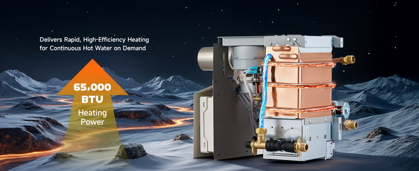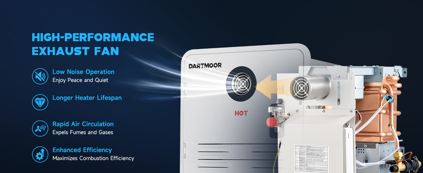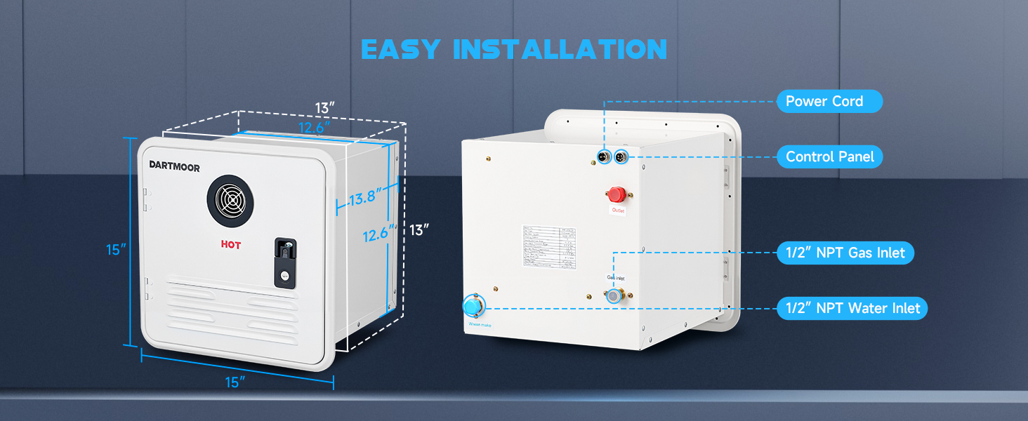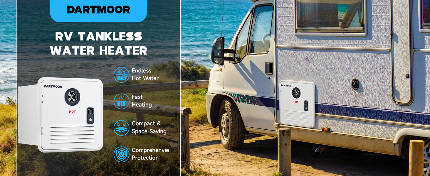 - Endless Hot Water: Dartmoor's RV tankless water heater delivers 65,000 BTU of power and a steady 2.4 gpm flow rate, ensuring continuous, on-demand hot water. Enjoy steamy showers and spotless dishes without ever running out—wherever the road takes you