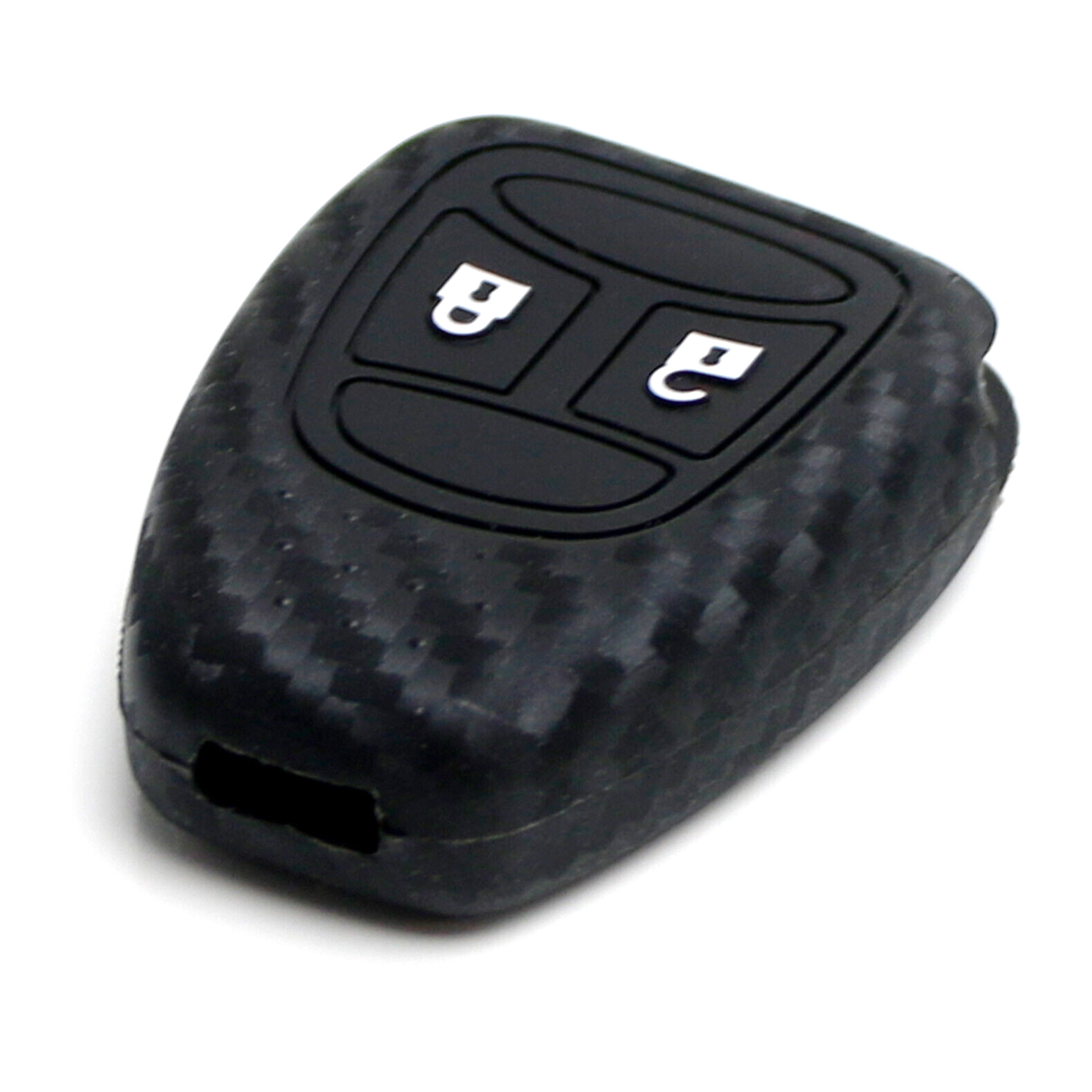 Key pouch is made of soft silicone with black twill weave pattern, carbon fiber look, locks/unlocks/starts engine with key cover open