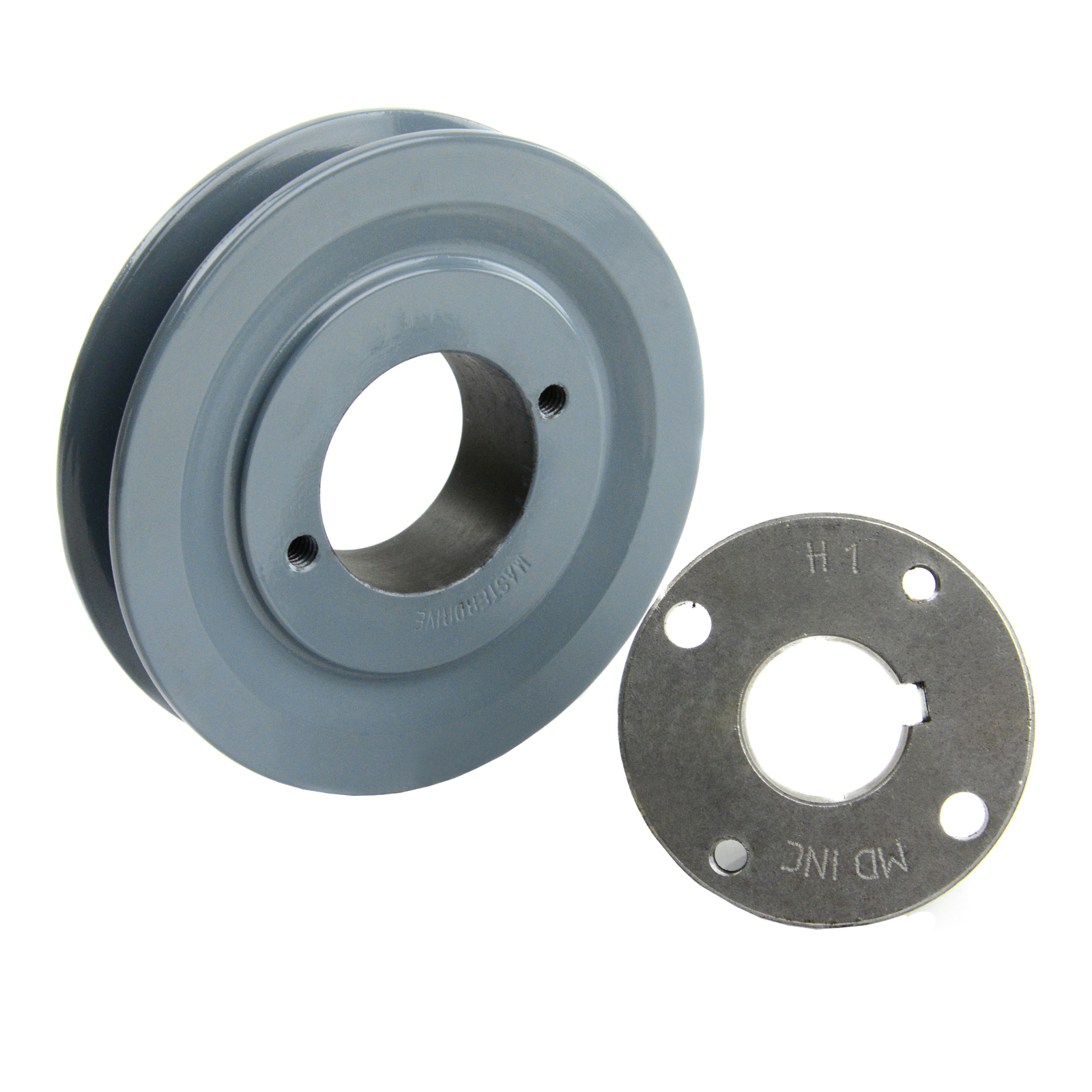 Masterdrive single groove 4.5" cast iron pulley/sheave with 1" H bushing for A section belt is a high-quality 2-piece pulley that measures 4.5" outside diameter and is designed to be used with an H style bushing. This bushing inserts into the center of the pulley and slides over the shaft, as you tighten down the bolts on the H bushing it will tighten down on the shaft. This style of pulley is much more secure than a standard single-piece pulley. The bushing is made of solid steel and precision machined to ensure high quality and secure attachment to your motor/engine shaft. This pulley accepts A Section also known as 4L series belts and is 1/2" wide.