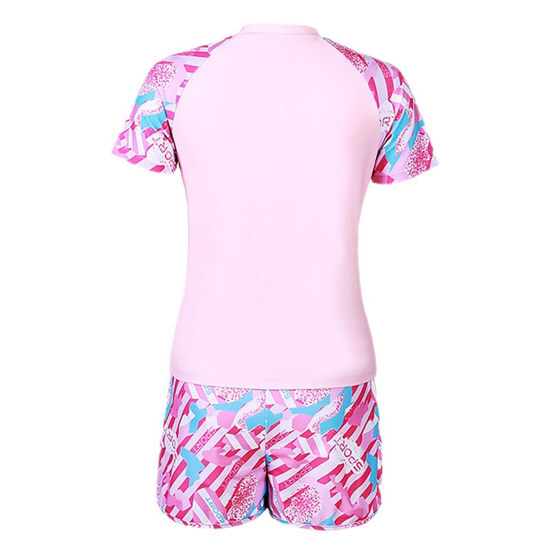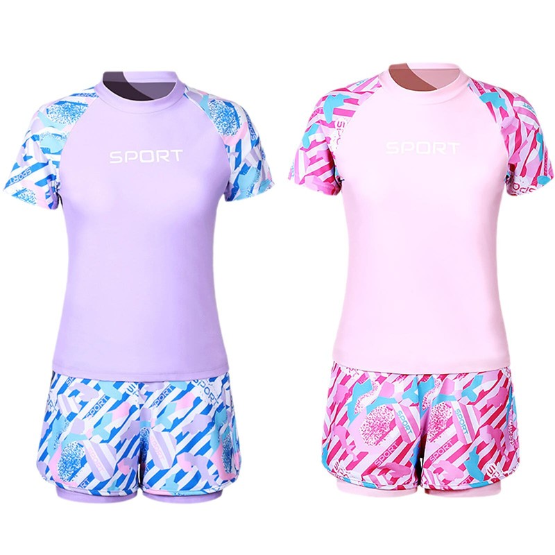 The round-neck short-sleeve T-shirt offers sun protection for the upper body, which is a practical and stylish choice for outdoor swimming.