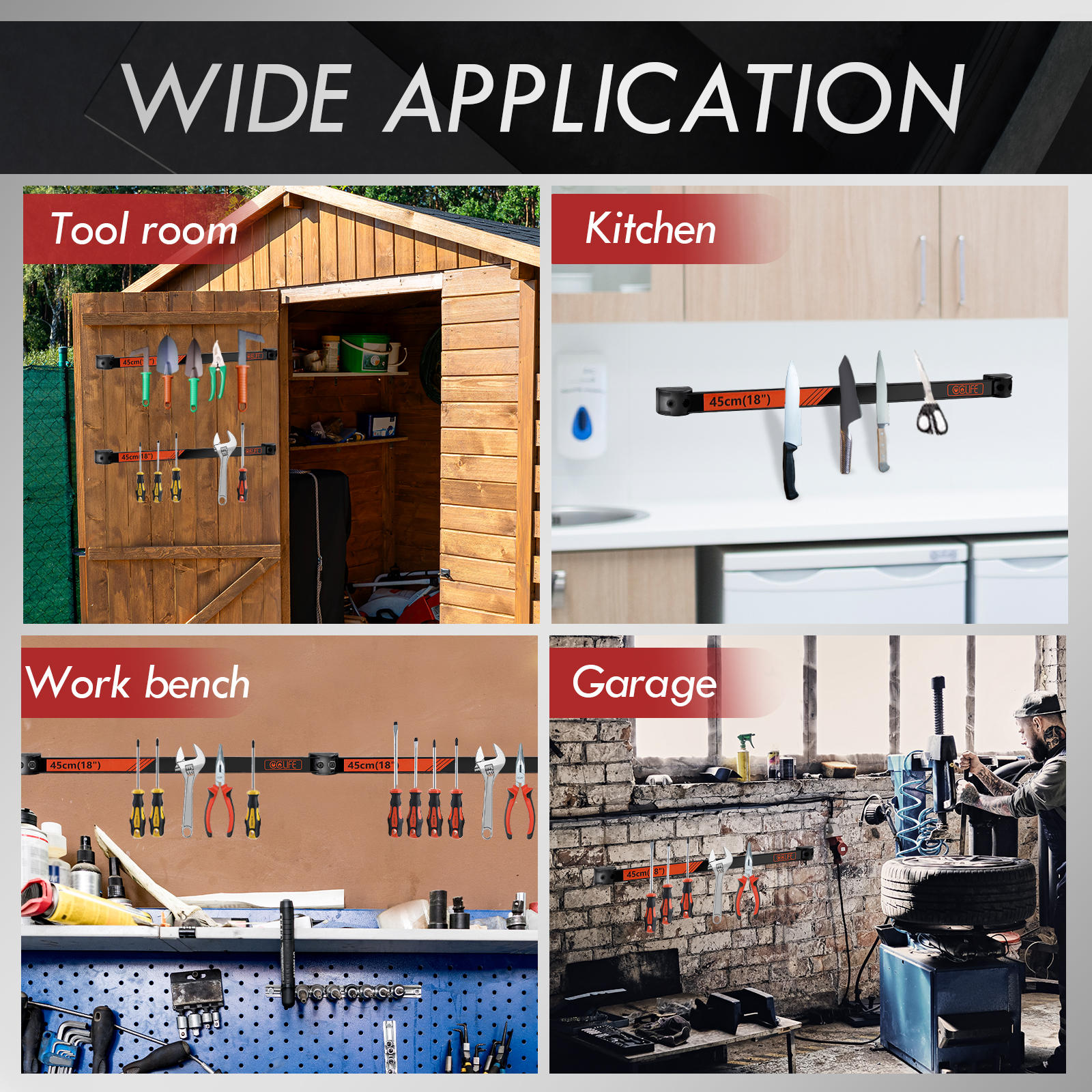 - Vielseitig einsetzbar: Der magnetische Werkzeughalter eignet sich ideal für die Garage, Werkstatt, den Werkzeugschuppen oder die Küche. Er hält Werkzeuge wie Schraubenschlüssel, Schraubenzieher, Zangen, Hämmer und Sägeblätter. Darüber hinaus kann er auch Schlüssel und Küchenutensilien wie Messer und Spatel sicher aufbewahren.