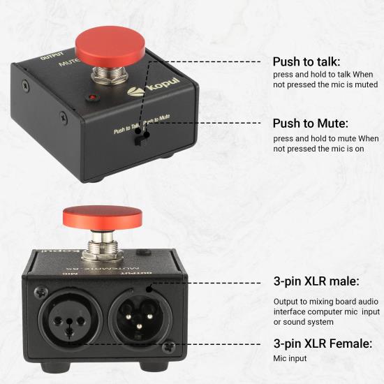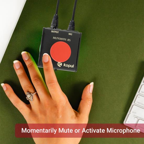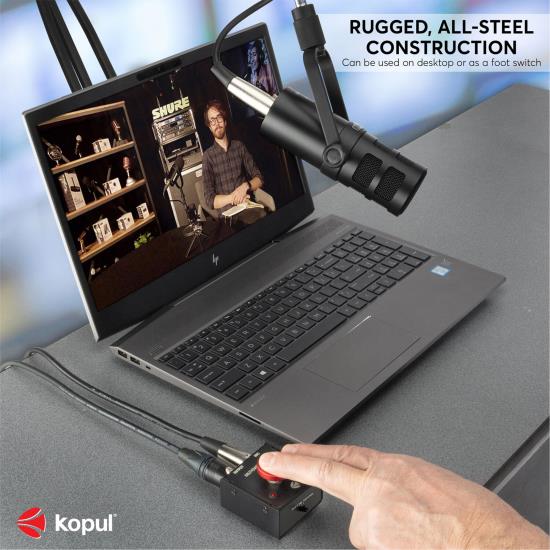 Take control of your microphone with the Kopul Mute/Talk Button, a momentary mute/talk button compatible with both condenser and dynamic mics. Perfect for online meetings, podcasts, or live events, it can be set to function as a temporary mute button, which you can press and hold to attenuate the mic level by 85 dB—preventing coughs or side conversations to be heard by the audience. Alternatively, it can be set as a temporary talk button, activating the microphone while you keep the button pressed. In both modes, an indicator LED lights up when the unit is active.The Mute/Talk Button features 3-pin XLR connectors for mic input and output to a recorder, sound system, or audio interface. Its rugged, all-steel construction makes it suitable for use as a desktop accessory or a foot switch. Mounting holes allow for permanent installation on podiums, walls, or workstations.
